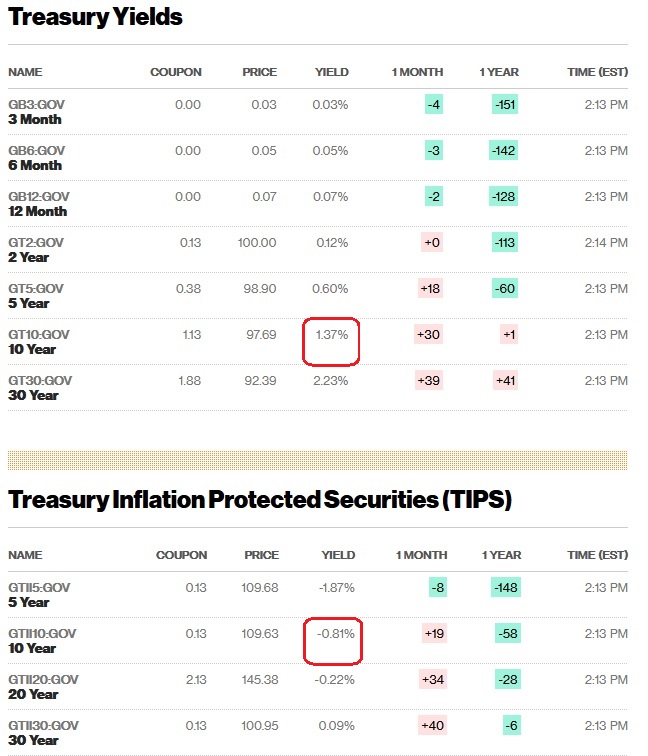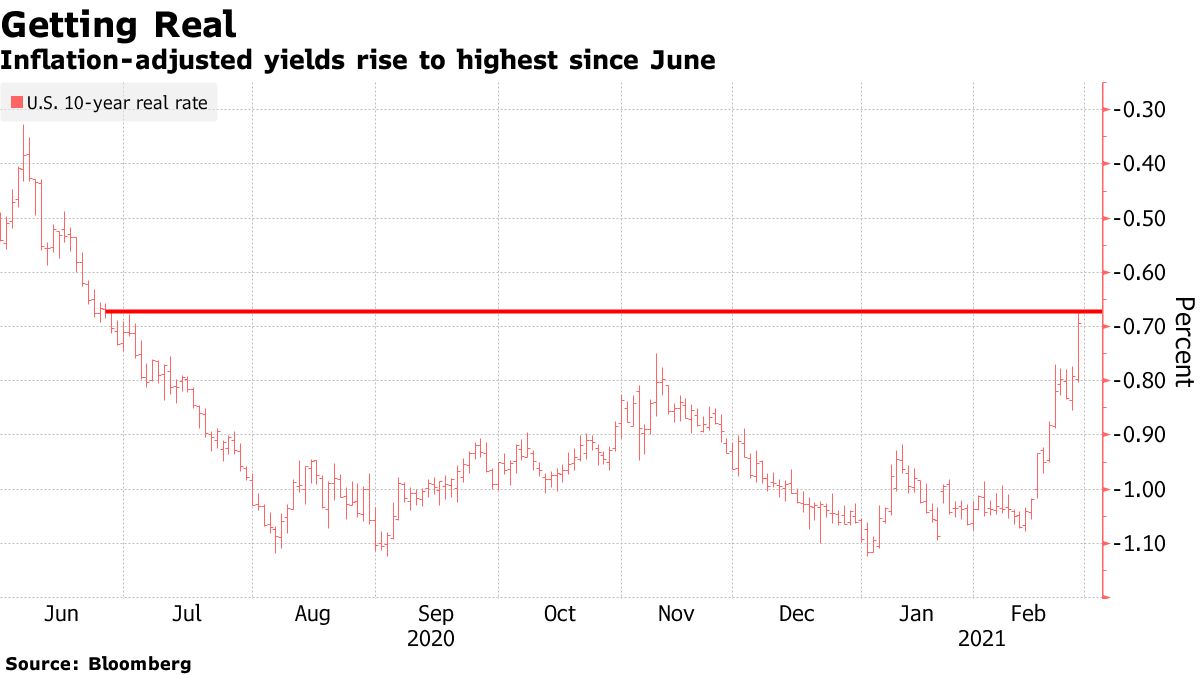 The 10-year U.S. real yield -- which strips out inflation and is seen as a pure read on growth prospects -- climbed as much as 11.5 basis points to minus 0.68%, surpassing its peak set after the U.S. presidential election in November.