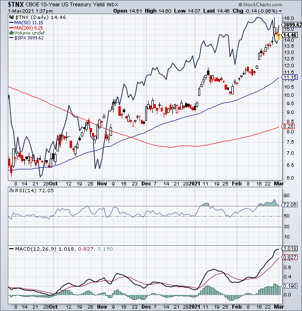 Von wegen steigende Renditen torpedieren die Aktienkurse und so weiter und so fort. Ein Blick auf den 5 Jahres-Chart der 10jährigen US-Renditen und vergleichend dazu des Kurses des S&P500 zeigt bitte nämlich was deutlich auf?