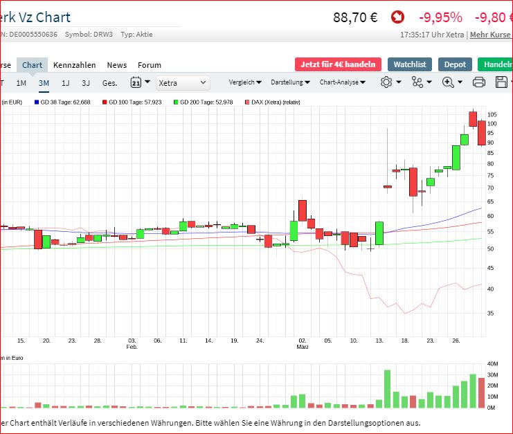 Expertenmeinung: Am 5. März hatte Drägerwerk seine 2019er-Bilanz vorgelegt: Umsatz +7,2 Prozent, Gewinn vor Steuern und Zinsen +3,9 Prozent. Ein Wachstum im Rahmen des Medizintechnik-Marktes. Die Gewinnmarge lag bei sehr moderaten 2,4 Prozent. Die Prognose für 2020 lag für Umsatzwachstum und Marge in beiden Fällen in einem defensiv gehaltenen Korridor zwischen einem und vier Prozent. Sogar auf Basis eines Gewinnwachstums von zehn Prozent in 2020 läge das Kurs/Gewinn-Verhältnis derzeit um 40 und damit für diese Wachstumsraten eigentlich um das Doppelte zu hoch. Das vorherige Kursniveau zwischen 50 und 60 Euro wäre daher angemessen, dieses aktuell um so viel höhere Level nicht.