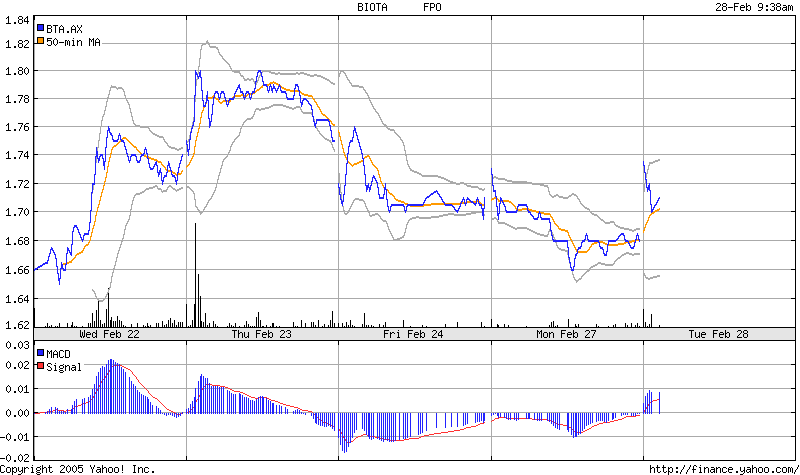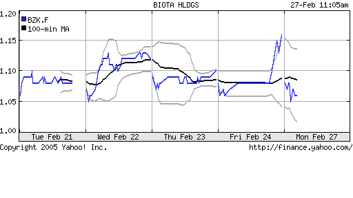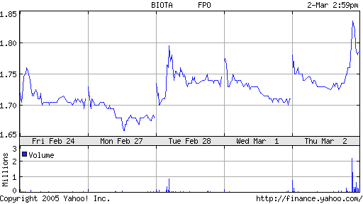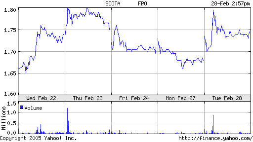 Im ersten Jahr der Zulassung besaß Relenza nämlich noch 50 Prozent Marktanteil im 500 Millionen Dollar Markt, doch die Einstellung der Werbemaßnahmen durch GSK ließ den Marktanteil innerhalb kurzer Zeit auf nur noch drei Prozent einbrechen. Die Tantiemen für Biota sanken so auf gerade einmal eine Million Dollar pro Jahr, während vergleichbare Konkurrenten rund 35 Millionen Umsatzbeteiligung einfahren konnten. Die Aktie von Biota hatte 1999 noch bei 9,10 Dollar notiert und fiel dann kontinuierlich, auch wegen Zulassungsproblemen, auf bis zu 67 Cents. Doch seit die Vogelgrippe Angst und Schrecken verbreitet, ist auch Biotas Aktie wieder zum Leben erwacht.