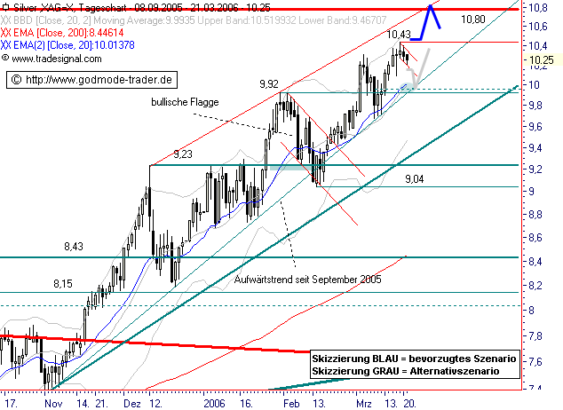 Silber ist heute knapper denn je, da das Edelmetall immer mehr von den boomenden Wachstumsmärkten China und Indien nachgefragt wird. Da die Fundamentaldaten des Silbermarktes gänzlich anders sind als die des Goldmarktes, sollte der Silberpreis bei einer starken Korrektur des Goldpreises sich von der Korrelation zum Gold entkoppeln. Zwar besteht auch für das Silber ein Rückschlagspotential auf etwa 9 US-Dollar, jedoch dürfte eine solche Korrektur, wenn Sie überhaupt stattfindet, nur von kurzer Dauer sein. Silber gewinnt zunehmend nicht nur als Industriemetall und Schmuckbereich zunehmend an Bedeutung, sondern vor allem als Ersatzwährung gegenüber dem kränkelnden US-Dollar.