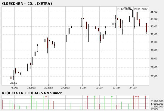 Die Experten von "Der Aktionärsbrief" sind der Ansicht, dass die Klöckner & Co-Aktie haltenswert bleibt. Ihr Kursziel würden die Experten von 37 Euro auf 39 Euro heraufsetzen. Falls es wegen Umplatzierungen seitens des Großaktionärs nochmals zu Rückschlägen kommen sollte, könne die Aktie um 32 Euro wieder gekauft werden. (Ausgabe 4 vom 25.01.2007) (26.01.2007/ac/a/d)