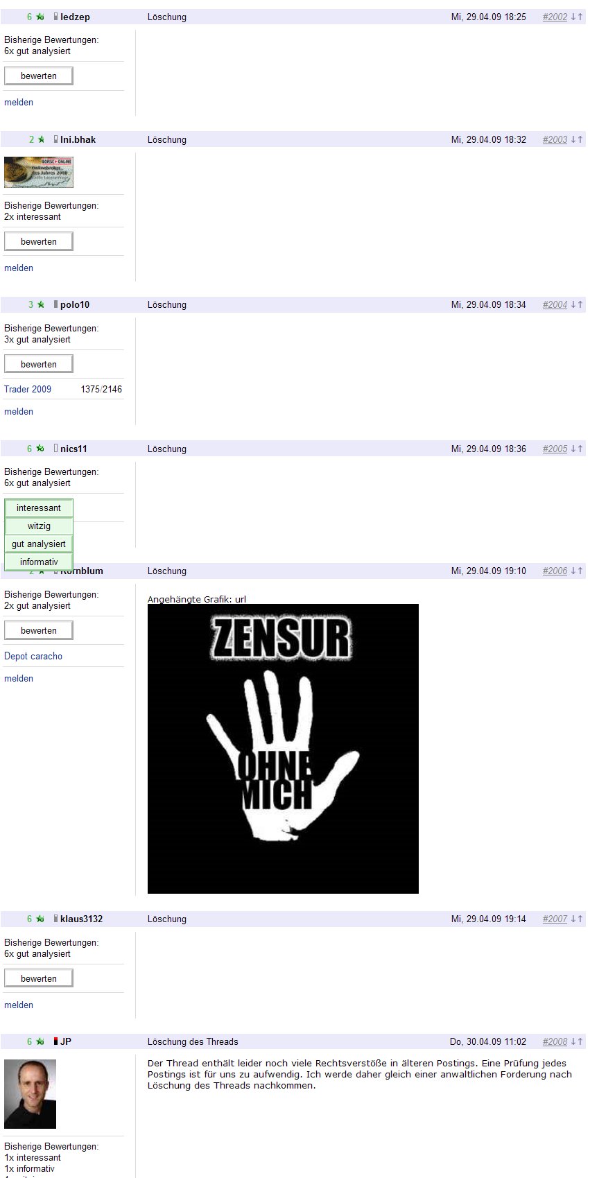 "...Ich werde daher gleich einer anwaltlichen Forderung nach Löschung des Threads nachkommen." http://www.ariva.de/...lands_Vermoegensvernichter_Nr_1_t293500#bottom Wenn da offensichtlich von außen Druck auf Ariva aufgebaut wird, kann man es denen natürlich nicht übel nehmen, wenn die lieber dem Druck nachgeben als sich auf eine unkalkulierbare Auseinandersetzung einzulassen. Immerhin ist das auf jeden Fall eine Ungeheuerlichkeit, unsere Diskussion wird auf Grund "einer anwaltlichen Forderung" eiskalt gelöscht. Man wird sich wohl denken können, welche Interessen hinter solch einem Angriff auf uns stehen. Irgendwie habe ich den Eindruck, daß in diesem Thread hier schon wieder die gleiche verbale Unreflektiertheit um sich greift, die schon die Handhabe zur Löschung des o. g. lieferte. Wenn dies nicht der nächste gelöschte Thread werden soll, so sollten wir uns doch so auszudrücken in der Lage sein,daß sich das nicht wiederholt. Man darf da von uns schon auch einfach etwas mehr Schläue erwarten. Andererseits wird sich ja selbst der dumpfeste Zeitgenosse seinen Teil denken können, wenn er unter dem Suchbegriff "Markus Frick" nur noch auf gelöschte Beiträge stößt... |