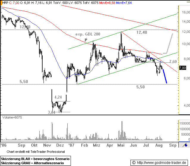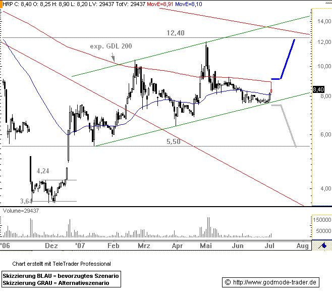 Rückblick: Die REINECKE&POHL Aktie (Nachrichten/Aktienkurs) markierte am 14.11.2006 ein Tief bei 3,64 Euro. Danach kam es zu einer kleinen Bodenbildung. Mit dem Ausbruch über den Widerstand bei 4,24 Euro vom 14.12.2006 wurde diese erfolgreich beendet, was zum Start einer massive, aber volatilen Aufwärtsbewegung führte. Am 15.01.2007 bildete die Aktie ein erstes Konsolidierungstief bei 5,50 Euro aus. Seitdem bewegt sie sich in einem Trendkanal nach oben. Am 02.05.2007 erreichte sie das bisherige Rallyehoch bei 12,03 Euro, womit sie am Widerstand bei 12,40 Euro scheiterte. Danach fiel die Aktie bis auf den Aufwärtstrend seit Januar 2007 zurück. Seit gestern zieht sie ausgehend von diesem Trend, der aktuell bei 7,66 Euro verläuft stark an. Jedoch ist zunächst einmal die exp. GDL 200 bei 8,91 Euro eine zu große Hürde.