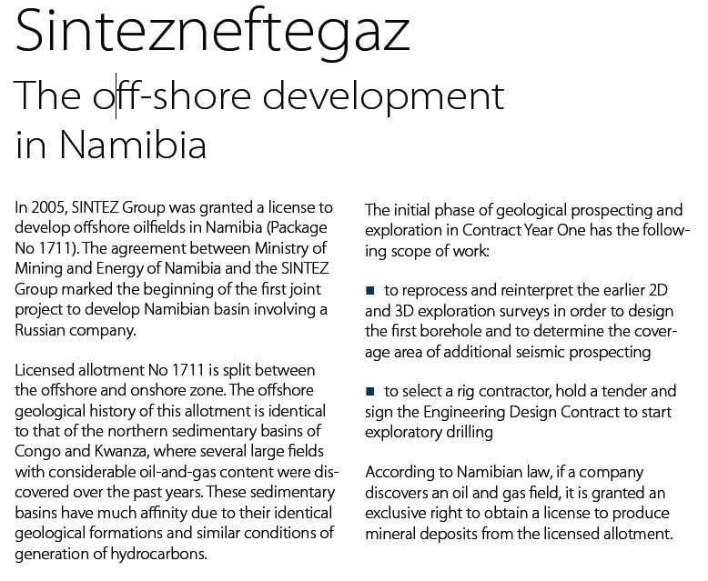Sintezneftegaz is exploration for oil in Block 1711 in Namibia's Namibe Basin, one of the country's richest prospects for oil deposits.