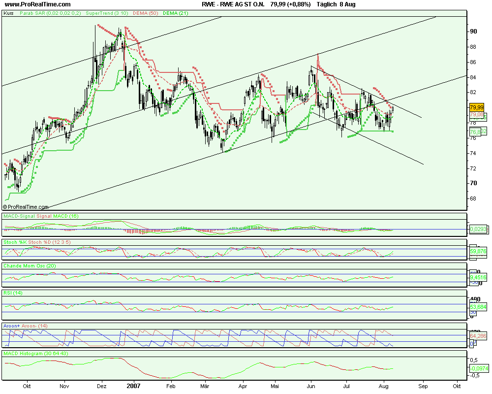 Die Aktie von RWE notiert aktuell mit einem Minus von 0,22 Prozent bei 79,20 Euro. (09.08.2007/ac/n/d)