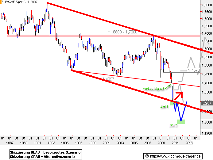 Erweist sich der aktuell laufende Ausbruch unter das alte Jahrestief bei 1,3073 CHF hingegen ls Fehlausbruch, wäre nach einer nachhaltigen Rückkehr über 1,3550 CHF nochmals ein Rücklauf bis 1,3900- 1,4000 CHF möglich. Oberhalb davon liegt bei 1,4300 - 1,4397 CHF der nächste Widerstandsbereich. Erst eine nachhaltige Rückkehr über 1,4573 CHF würde jetzt ein kleines Kaufsignal auslösen, dann könnte sogar eine mehrjährige Aufwärtsbewegung von EUR/CHF starten.