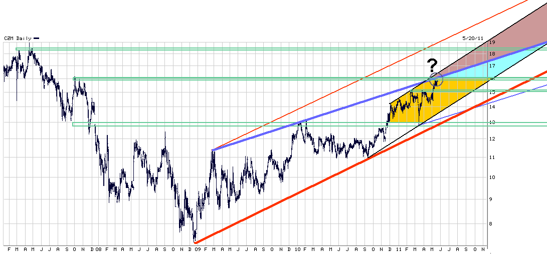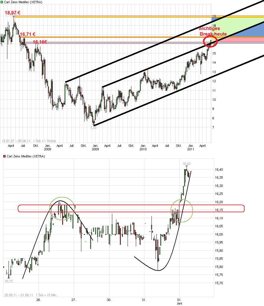 Mir ist die Analyse von Godmode von der Zeitebene her etwas zu kurzzeitig orientiert. Bei einem Blick auf einen etwas längeren Zeitraum fällt einem aktuell bei roundabout 16€ ein Kreuzwiderstand auf mit der alten horizontalen Widerstandsmarke bei roundabout 16€ und der deckelnden oberen blauen Trendkanalline des seit Frühjahr 2009 steigenen Aufw.trendkanals. Erst wenn der horizontale Widerstand bei 16€ nachhaltig übewunden wird und im Anschluß auch die deckelnde obere blaue Linie überwunden wäre, dann würde sich ein neues starkes Kaufsignal ergeben Richtung 18,5/19€ ergeben. Aktuell notiert man weiter erstmal nur unterhalb des jüngsten Tops vom 11.5. bei 16€. Wer einsteigen oder nachkaufen will, sollte damit aus meiner Sicht vielleicht besser noch warten bis diese Marke auf SK geknackt wird. Alternativ wäre auch noch vorstellbar im Falle einer Korrektur im tiefen 15er Bereich zu kaufen. Wichtig wäre, daß man nicht mehr auf SK unter die horizontale Unterstützung von 15,15/15,00€ fällt. Somit hat man aktuell eine "Nebelzone" von ca. einem 1 Euro, wo sich nun erweisen muß, ob die Bullen oder die Bären die Zügel in die Hand nehmen wollen. Fundamental sind höhere Kurs vertretbar. Einzig störend ist, daß man sich doch zunehmend den tradionell eher schwachen Sommermonaten an der Börse nähert. Lassen wir uns überraschen, ob dieses Jahr wieder diese Sommerflaute kommt oder ob der Rückenwind vom Frühjahr bis in den Herbst die Aktie von CZM trägt.