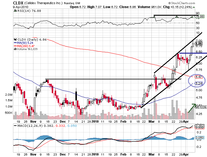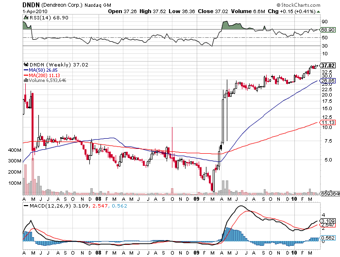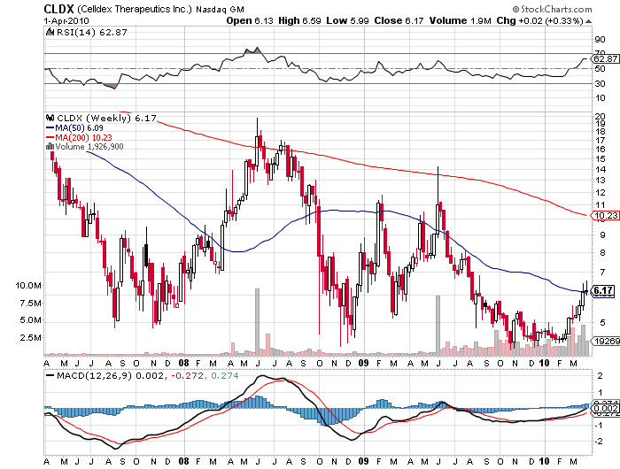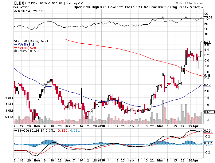 CLDX is primarily in the cancer vaccine business. The stock was in the $20’s in 2008 and made $14 in 2009. A very, very smart drug analyst (certainly smarter than me) recently said he believes CLDX could double in value in 2010. CLDX bought CuraGen because it has a drug in Phase II trials for breast cancer and a number of pre-clinical antibodies in development. The same analyst also noted that CLDX has a ‘full plate’ with its clinical trial pipeline. CLDX could be bought up or ‘thoroughly partnered’ at its current is my speculation. In any case, the stock is on the rise and a strong move into Phase III on its breast cancer drug could propel the stock back to its $14 level. But an FDA setback could send the shares reeling. Boom or Bust? Too close to call on this given day. Some Company news wouldn’t hurt.