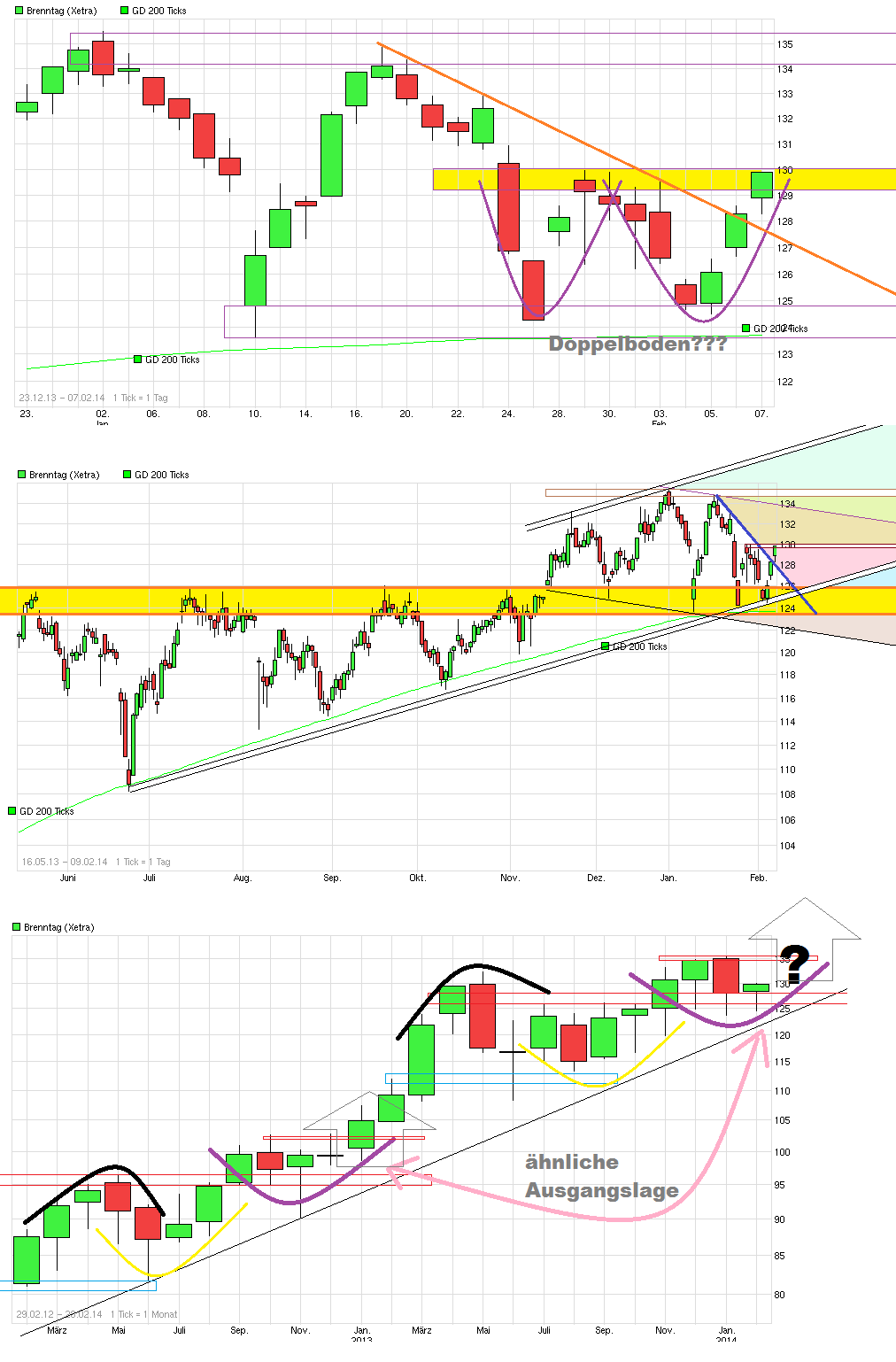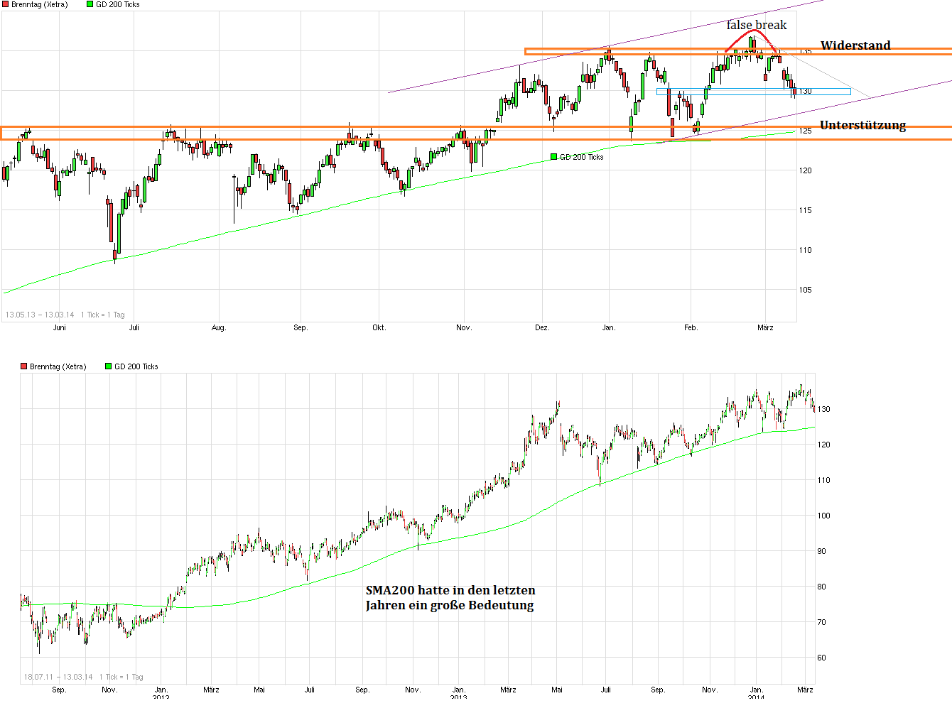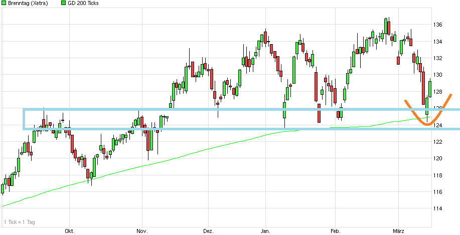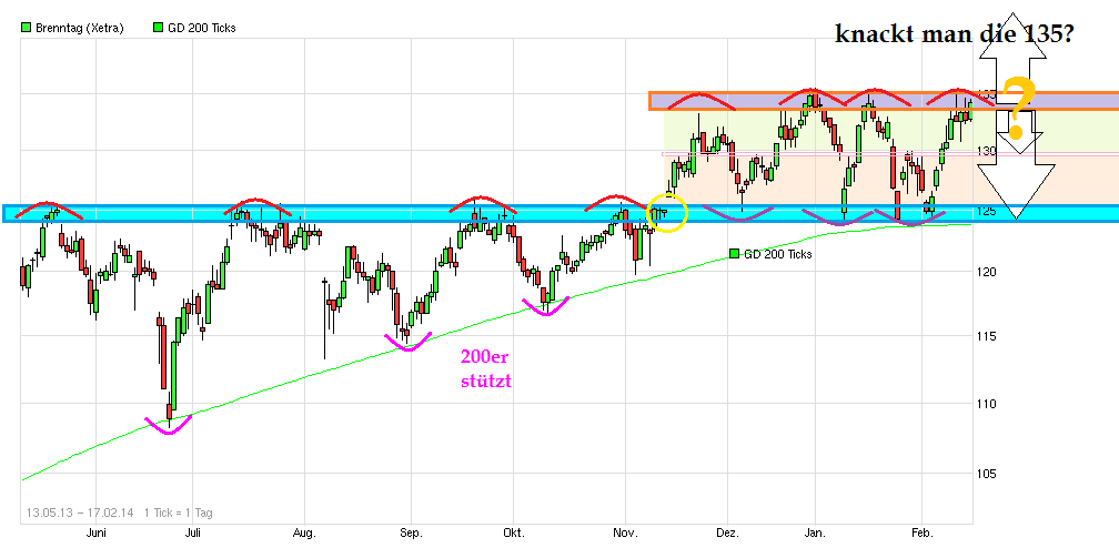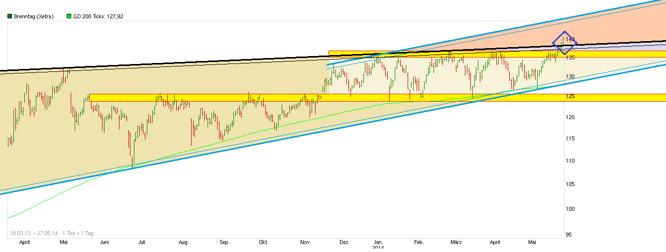 als "Festung" bewährt hat gegen größere Rücksetzer, könnte jetzt vielleicht endlich der Ausbruch nach oben gelingen, wenn man die Region 135/136 nachhaltig verteidigt. Die 200er ist inzwischen auf 127,7 € angestiegen. Somit rückt von unten stetig die "Festung" nach. Solange die Mauern der Festung nicht nachhaltig brechen sieht es weiter solide aus. Ein Belastungsfaktor der letzten Quartale war ja die zunehmende Eurostärke, da Brenntag auch im Dollarraum nicht unerheblich aktiv ist. Da Draghi ja offensichtlich den Euro wieder schwächer haben will und neben den bisherigen verbalen Interventionen auch am 5.6. mal Taten sprechen lassen dürfte, kommt von der Währungsseite etwas Rückenwind für Brenntag auf. Zudem verbessert sich ja auch die Konjunktur in den USA und in Europa stetig wieder etwas weiter. Sollte also nicht der Gesamtmarkt wieder in sich zusammenfallen, dann könnte Brenntag jetzt vielleicht aus der Seitwärtsschaukel rauskommen, um den nächsten Schritt nach oben wieder zu gehen. Bankhaus Lampe hat vorgestern das KZ von 145 auf 155 erhöht Brenntag-Aktie: Organisches Wachstum zieht an - Kursziel auf 155 EUR erhöht - Bankhaus Lampe - 20.05.14 - http://www.aktiencheck.de/exklusiv/...R_erhoeht_Aktienanalyse-5724901 => "....Bankhaus Lampe, rät in seiner aktuellen Aktienanalyse die Aktie der Brenntag AG weiterhin zu kaufen. Die Q1-Zahlen hätten nach Erachten von Feber gezeigt, dass sich das organische Wachstum belebe und die Restrukturierung in Europa greife. Zudem sollten die Ergebnisse in Nordamerika deutlich anziehen, da die Auswirkungen des kalten Winters in den kommenden Quartalen entfallen dürften. Darüber hinaus erwarte der Analyst aus Übernahmen zusätzliche Ergebnisbeiträge. Feber gehe davon aus, dass die Hauptversammlung am 17. Juni dem geplanten Aktiensplit (1:3) zustimmen werde. Zudem erwarte er angesichts eines organischen Wachstums des Bruttoergebnisses je Arbeitstag von 4,1% im April für Q2 eine deutliche Ergebnisverbesserung sowohl gegenüber Q1/2014 als auch gegenüber Q2/2013 ... Das EBITDA dürfte in Q2 gegenüber dem Vorjahresquartal um 15% auf 196 Mio. EUR gesteigert werden. Bankhaus Lampe, hebt in der aktuellen Aktienanalyse sein Kursziel von 145 EUR auf 155 EUR an und bekräftigt seine Kaufempfehlung für die Brenntag-Aktie. .." |