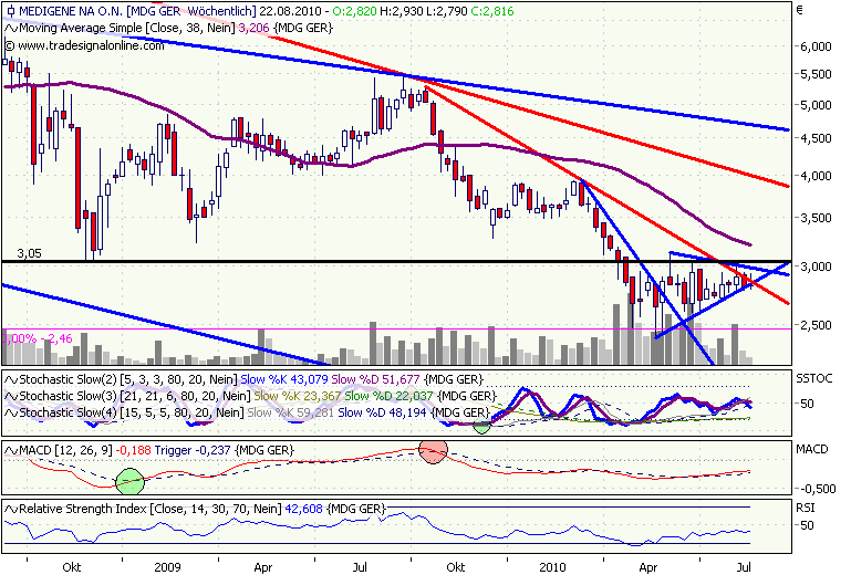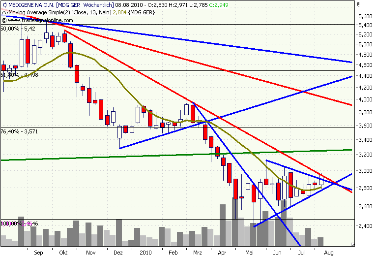 Dieser chart ist mit Wochenkerzen, die Erkenntnisse damit träger. Sollte Medigene den Ausbruch aus Downtrend und steigendem Dreick schaffen, dann dürfte es bis ca. 3,75 gehen. Da waren die Hochs von Januar und März.