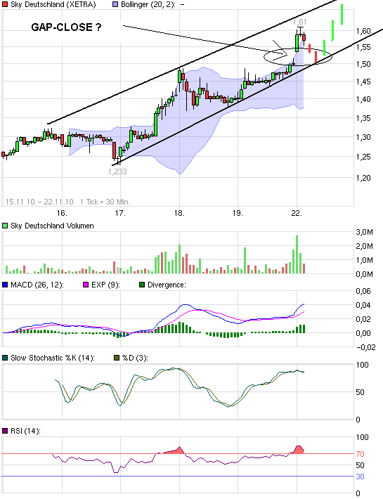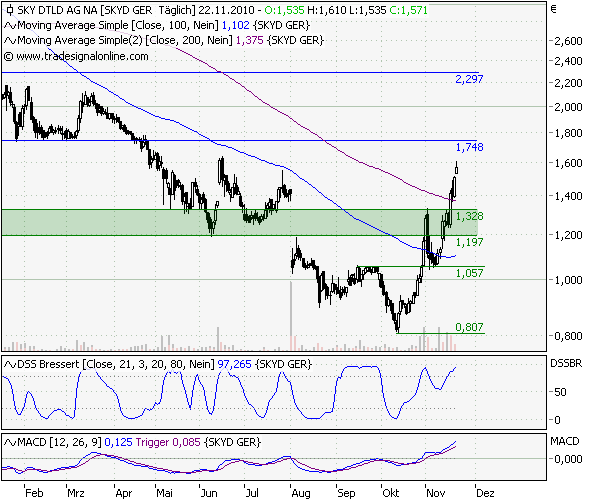 Händler verwiesen weiterhin auf einen Medienbericht vom Donnerstag der Vorwoche, demzufolge der Bezahlsender und die Deutsche Telekom über eine Wiederaufnahme ihrer Fernsehzusammenarbeit diskutieren. Es gehe wohl um die Ausstrahlung des Film- und Sportprogramms von Sky im Internet-TV der Telekom. Ausgenommen wäre davon die Bundesliga, für die der Ex-Monopolist bereits 2008 eigene Rechte für die Ausstrahlung im Netz erworben hatte. Die Spekulation ist zwar nicht neu, wie Börsianer sagten, unterstütze aber dennoch die Aktie. Im Hintergrund wirke auch die Erwartung weiterer Kooperationen mit Kabelnetzbetreibern positiv und auch das gute Chartbild beflügele die Titel.