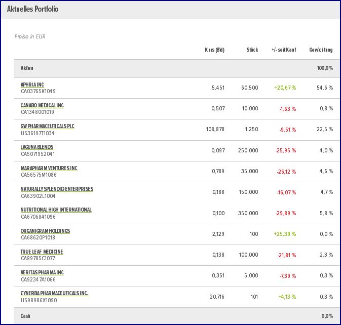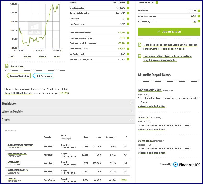 Werter Anleger, hallo Trader, geschätzter Interessent u. Investor, einen letzen Versuch ein wirklich aussichtsreiches und tragfähiges Wikifolio an die Hand zu geben. Mit den gemachten Erfahrungen aus den beiden ersten Wikifolio-Zertifikaten, lanciere ich ein Jahr nach der Erstemission meines ersten Zertifikats, ein weiteres und definitiv mein letztes Wikifolio mit Anlageschwerpunkt "Medical Marijuana" , "Cannabis" , "Cannabidiol" (CBD) und Cannabinoids (CBDA/CBDN/CBDV). Als Strategie möchte ich eine sehr zügige Zulassung zum Handel, vorausgesetzt es erfolgen ausreichend schnell -hohe und zahlreiche- Vormerkungen, beantragen und die aktuelle Markt- und Branchenschwäche, bei hohem Cash-Bestand ausnutzen. Der "Anfängerfehler" war wohl, dass ich mit zu hohen Investitionen und zu wenig Cash, beim Emissionstermin,bereits ein sehr gut laufendes Zertifikat hatte, welches in der Folge nur schwächelnde Performance ausweisen konnte. Aktuell ist der erste Hype vorbei, die Spreu hat sich getrennt und Unternehmensbeteiligungen und M&A 's haben klarere Konzepte/Strategien und Umsatzentwicklungen erkennen lassen. Die ersten Krisen bezüglich kontaminierter / belasteter Endprodukte wurden gemeistert und haben die Sensibilität der Branche deutlich gemacht. Auf aktuellem Niveau erscheint mir ein "Restart" mit einem gänzlich neuen Wikifolio-Zertifikat aussichtsreich. Die bestehenden Zertitikate werde ich weiterhin konsequent und gewissenhaft mit vollem Engagement weiterführen, da ich von meinen Investitionen und beinhalteten Titeln weiterhin überzeugt bin. Über viele und hohe Vormerkungen bedanke ich mich und hoffe dadurch das "Medical Cannabis & CBD Industry" - Wikifolio möglichst schnell zertifizieren lassen zu können.