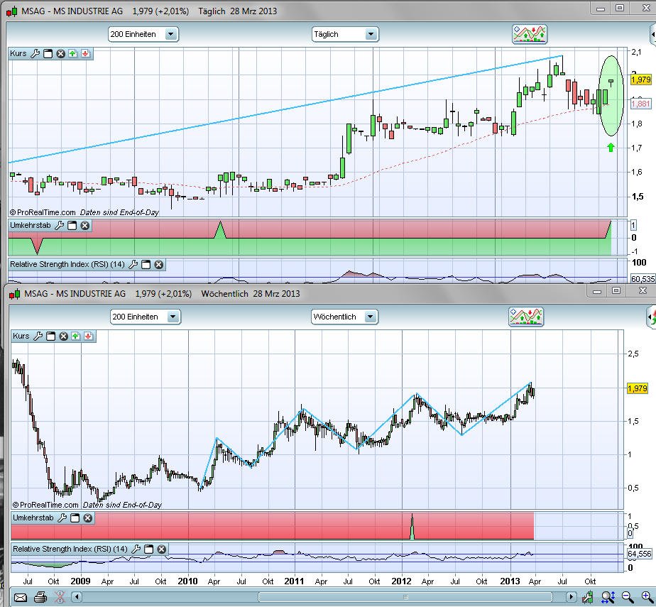 Wenn ich mir den obigen Chart anschaue, dann sind doch 2 Szenarien am wahrscheinlichsten: Variante 1: Wir befinden uns jetzt in etwa in der gleichen Position wie im Dezember 2010/Januar 2011 bzw Januar 2012. Dies würde implizieren, dass wir jetzt in Kürze (z.B. nach den Zahlen) zum zweiten Schwung ausholen, der uns etwa bis in den Bereich 2,10-2,15 trägt. Dies würde dann genau dem Februar/März 2011 bzw. dem März/April 2012 entsprechen. Würde eigentlich sogar ganz gut passen, weil jeder Zyklus dann zielich genau 13 Monate dauert und der dritte Zyklus dann eben jetzt im April/Mai abgeschlossen werden würde und der Wert dann wieder für etwa 7-8 Monate konsolidert. Variante 2: wir haben jetzt schon unser nächstes Treppchen erreicht und pendeln zwischen 1,80 und 2,00 bis etwa 9/2013 Die Zahlen am 29.4/30.4 werden wohl zwischen Variante 1 und 2 entscheiden. |