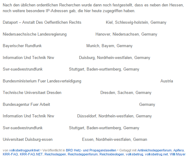 cindy schreibt: 8. April 2011 um 16:52 weil eine alte rentnerin meine wohnung für ihren enkel haben wollte erlebte ich die hölle.sie hetzte andere gegen mich auf,betrieb rufmord,zerstörte meine zukunft,mein leben,meine gesundheit,aber trotz beweise halfen alle der alten,sogar mit stock und messser verletzte die mich. räumungsklage bekam ich sogar wegen der alten,es wurde behauptet die wohnung sei dreckig,zugemüllt,verwahrlost jeder aber wußte das man bei mir auf dem boden essen konnte. diese privatpersonen zollner,pilsner lehnte eine einstweilige verfügung ab glaubten der hausverwaltung obwohl ich morddrohungen und schlimmste beleidigungen u.a.vorweisen konnte. vor gericht wurde auch beweise ignoriert,,die privatperson die sich richter niklas meinte,wer so viele anzeigen wegen etwas feuchtigkeit und schimmel mache und gegen alte beschwerden schreibe sei nicht geschäftsfähig und müßer unter betreuung,aber dieses verfahrer wurde eingestellt weil wenigstens dieser richter alle beweise ansah und nur den kopf schüttelte. ging zu richter niklas vor und sagte ich möchte seine legitimierung sehen das er gesetzlichrer richter sei,wie der mich anglotzte,türlich füllte er den vordruck nicht aus,gab mir den namen seiner haftpflichtversicherung mit höhe der decksumme auch nicht raus. regte mich gegen so viel dreistigkeit auf und sagte…so bürscherl schluß mit lustig,mit welchem recht verurteilst du hier illegal leute,begehst täglich schwerste straftaten im amt,dich müßte man in zwangspsychatie geben und mit lebenslänglich mit sicherungsverwahrung bestrafen,mit mir spezl treibt su dein spiel nicht. er nahm seine zettel die er akte nennt stand auf und ging,wochen später kam ein schreiben,eigentlich eine antwort auf räumungsklage,urteil,nichts stand drin weder das ich ausziehen muß noch sonstiges.und ruhe hab ich bekome ich nun post von gerichten,gez oder anderen privatfirmen die sich ämter nennen schick ich alles zurück,da der postbot diese nicht zustellen darf und auch kein recht haben mich anzuschreiben zurücksendung von post, im internet steht da was,zustellung illegal,auch aufdruck für briefkasten ist mein eigentum steht was,nie wieder wagt man es zu schreiben oder was einzuwerfen.ich lass mich nicht einschüchtern sondern verschaff mir respekt. auch ein gerichtsvollzieher hätte sich hier schon breit gemacht,er zückte wie alle seinen ausweis,ich sagte er möge seinen gefälschten wisch wegnehmen und lang gewinnen,er meinte er sei gerichtsvollzieher,ich ….studiert vielleicht aber nur privatperson ohne legitimierung ignoriert alles,das die brd ein illegales land ohne hoheitsrechte ist,nur scheinrechte für diese anmassenden typen die sich politiker nennen,es gibt weder diese noch beamte hier.seither hab ich hier keinen mehr gesehen,er hatte angst vor mir suchte schnell das weite,ich sagte das er nur ein geldeintreiber sei mehr nicht und ein hochstapler,leute habt den mut ihr seit ihm recht diese fuzzi können nichts machen weil es keine gesetzlichen richter gibt der rechte hätte.gerichtsvollzieher hat zwar haftbefehle dabei er aber keine befugnisse zu8 verhaften,holt er die polizei können die auch nix tun da die ja nicht den haftbefehl zur eidesstattlichen versicherung haben.also diese typen nie rein lasse3n hausfriedensbruch.noch mehr sie können gern schreiben |
