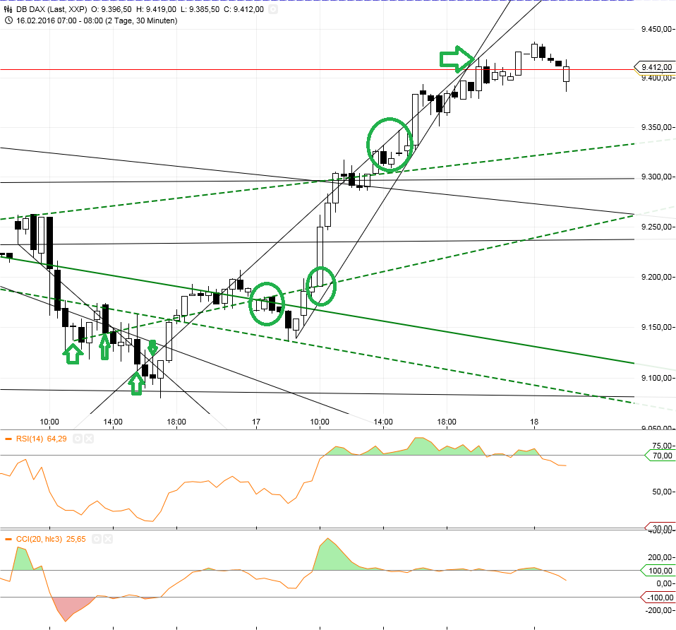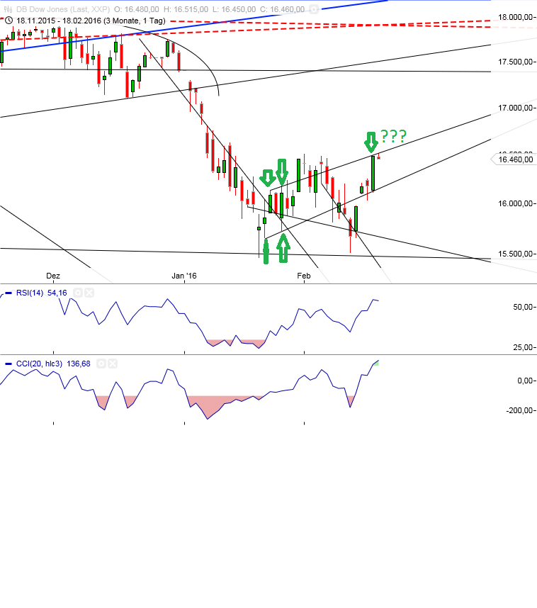 Daß das heute schon war . Wenn die 400 überwunden werden, geht es auf die nächste Stufe. Wie schon gesagt, ärgere ich mich, daß ich die Calls verkauft hatte. Wie ich werden die Leute steigenden Kursen hinterherlaufen, vor allem, wie ich meine am Freitag. Mars Trigon Jupiter läßt nichts anderes zu . Erst danach sollte man wieder die Seite wechseln . Ich hoffe, daß heute Abend und morgen ein Rücksetzer kommt. Da ich die Fibonaccizahlen und goldene Schnitte gelesen hatte, Konnte ich die Nacht den Komputer im Hirn nicht abstellen, und heutige Müdigkeit machte mich lahm. Macht aber nichts. Hatte vorher schon tüchtig verdient. Das wünsche ich uns allen, und ich bin sicher, daß dieser Wunsch in Erfüllung geht. Interessant war heute die Nachricht von erhöhten Preisen, obwohl Öl gefallen war. Es könnte sein, daß die Fed hinterherlaufen muß, was vielleicht auch erwünscht ist. Daß Draghi die Geldmengen erhöhen will und Japan Negativzinsen einführt, erscheint mir Aktivismus zu sein. Aber wer will schlauer sein als diese Leute ? Genaueres später ? |