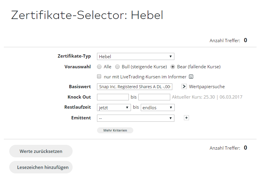 In meinem Zertifikate Selector der CoDi finde ich keine Put auf die Snap Aktie, während es 81 Calls gibt.... das ist ja schon sehr verdächtig^^