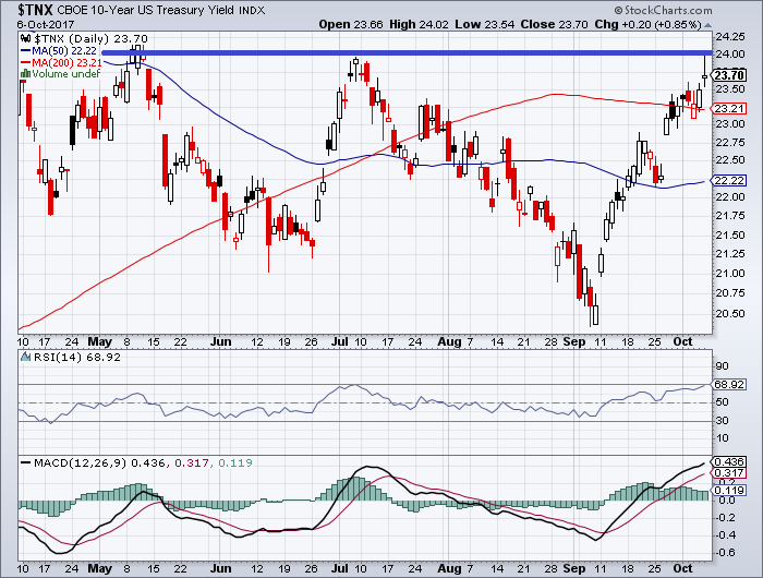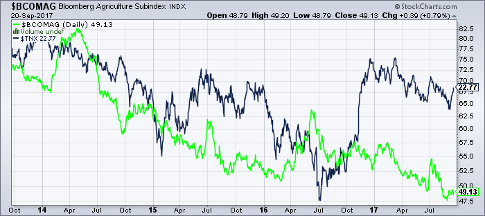 Den damaligen recht steilen Anstieg der Renditen bei den 10jährigen nach der Wahl hatten die Agrargüter allerdings nicht nachvollzogen. Zu Anfang 2017 wurde jedoch der Verfall im gemeinsamen Trott hier wieder bis zu Anfang September aufgenommen. Seit diesem Zeitpunkt klafft jedoch eine erhebliche Lücke aka Divergenz in den Entwicklungen auf.