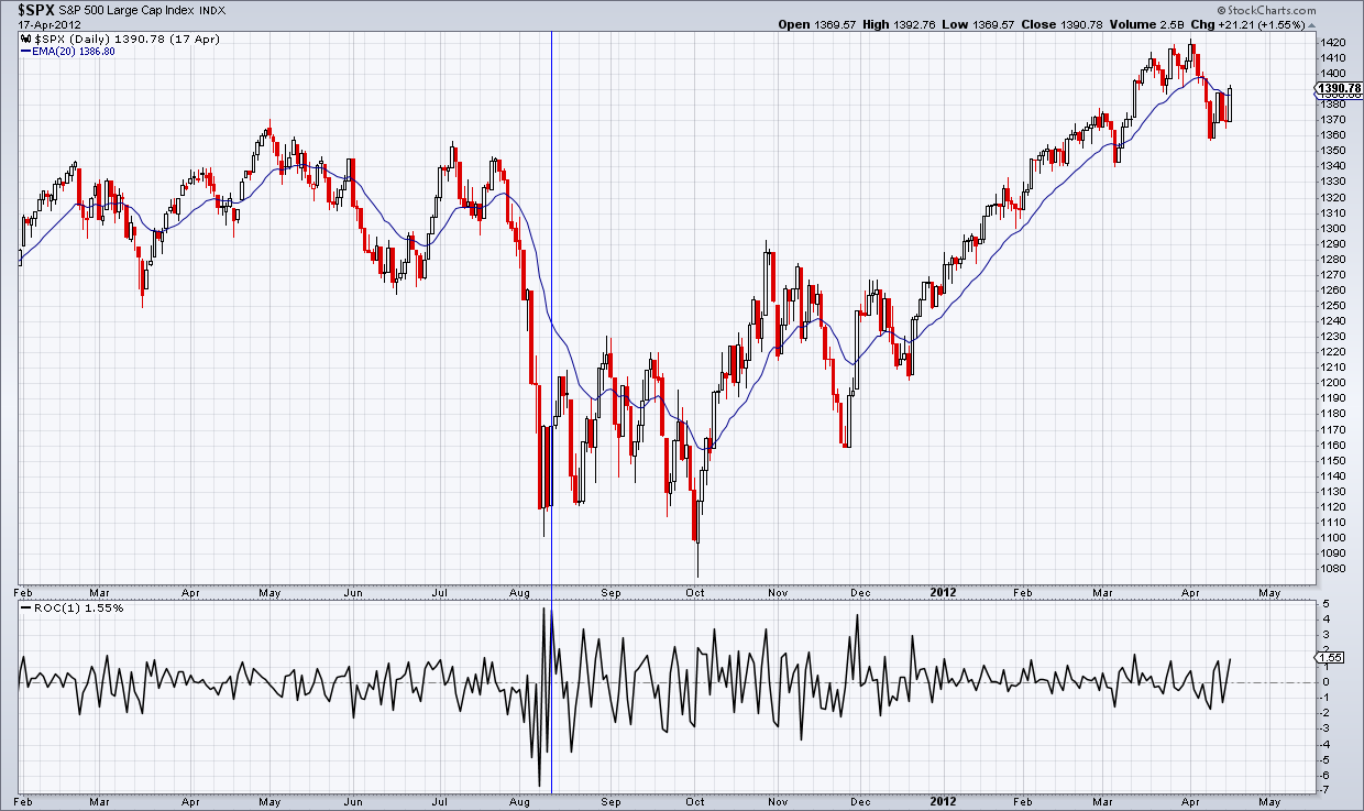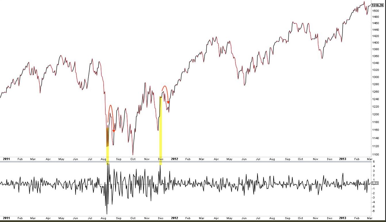 hab mal ein wenig gestöbert - die starken Ups heißen eventuell nicht viel. 2011 hatten wir 2 5%+ tage und es blieb volatil. (heißt jetzt nicht, dass man shorten muss, aber kann man ja im hinterkopf behalten)