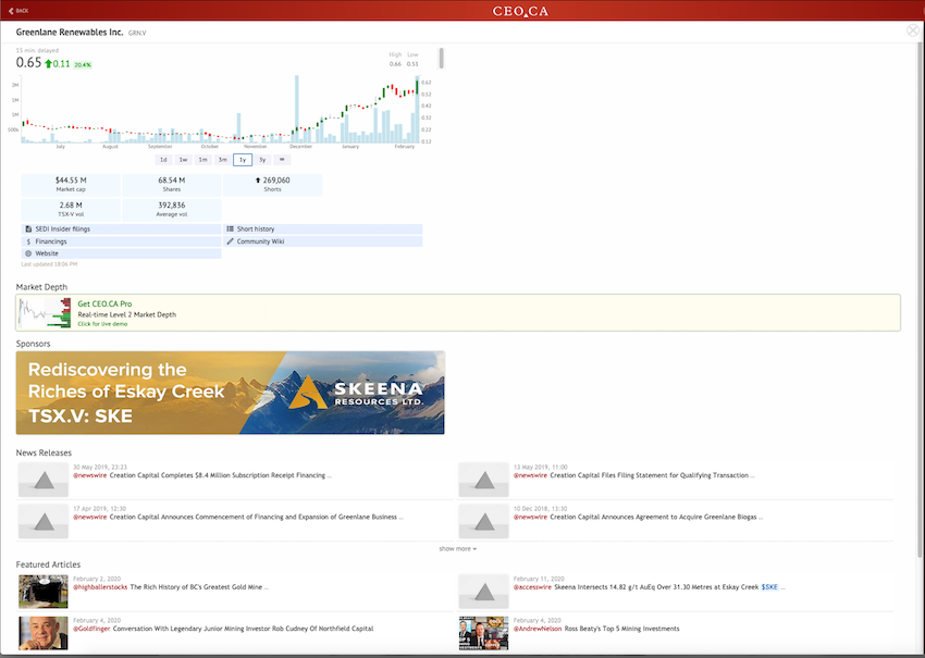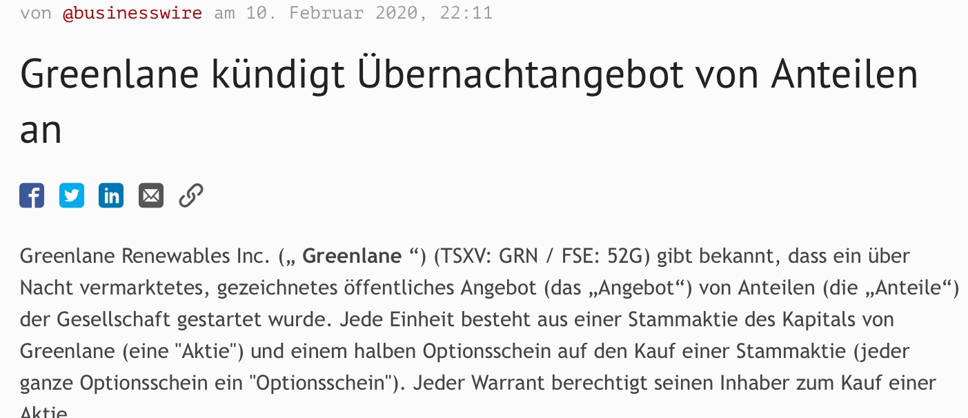 | Greenlane Renewables Inc. (TSXV: GRN) (“Greenlane” or the “Company”) announces the size and pricing of its previously announced underwritten public offering (the “Offering”) of 20,000,000 units (the “Units”) of the Company at a price of $0.50 per Unit, for gross aggregate proceeds to the Company of $10,000,000, before deducting the underwriting commission and estimated Offering expenses payable by the Company. In addition, Greenlane has also granted the underwriters of the Offering an option to purchase up to an additional 3,000,000 Units on the same terms and conditions for a period of up to 30 days from the closing of the Offering. |
