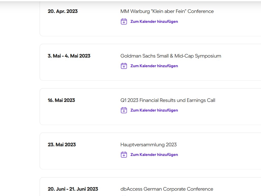 Auf der Grundlage eines ausgezeichneten Q1/23 unterstreicht das Unternehmen seine Prognose für das Geschäftsjahr 2023, die IFRS-Umsatzerlöse um 13 - 19% auf €165 - 175 Mio. zu steigern und ist ausgesprochen zuversichtlich, den Break-even beim bereinigten EBITDA in 2023 zu erreichen.