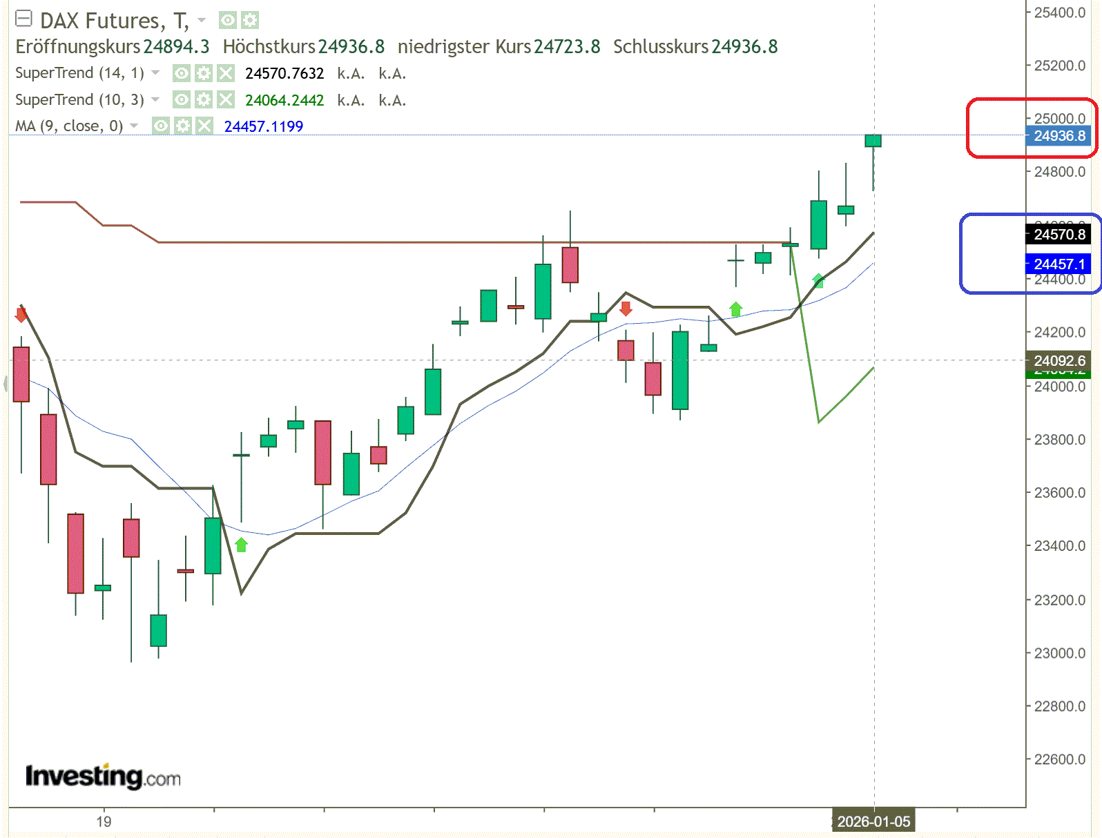 Aus seiner bemerkenswerten 2025er Rallye ist der DAX im Juni in eine seitwärts laufende Korrekturphase übergegangen, die sich trotz kurzfristigem Druck auf das Juni-Tief über dem März-Hoch hält. Zuletzt rang der Index verstärkt um die 24.000er-Marke, wo sich aber weitere Schwäche abwenden ließ. In der Erholung der vorangegangenen Handelstage wurde auch zum Jahreswechsel ein fester Markt bestätigt, wodurch die 24.500er-Marke zum Ende der Woche Bestand hatte. Der Start in die erste volle Handelswoche des Jahres dürfte am Montag Indizien für den weiteren Verlauf liefern, wobei sowohl neue Allzeithochs als auch Druck auf das Vorwochentief möglich sind.