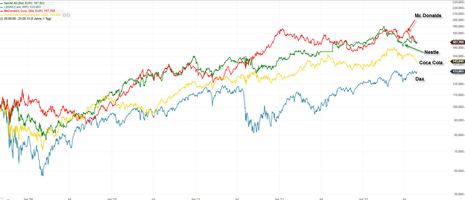 Quelle: http://www.nestle.com/asset-library/documents/...al-statements-de.pdf Eigenkapital der Aktionäre: 60947 Mio CHF Total Assets: 126229 Mio CHF Gesamtverschuldung: 65282 Mio CHF Prozentualer Anteil des Eigenkapitals: 48,3 % Prozentualer Anteil des Fremdkapitals: 51,7 % risikoloser Zinssatz 10 year US treasury bill: 3 % Steuersatz Nestle: 25,7 % Erwartete Investorenrendite: 10 % Beta (Risikokennzahl für das Investment Quelle Reuters): 0,55 Nestle Anleihenrendite pessimistisch gemittelt (zum Nachteil des Unternehmens): 4 % Damit lässt sich das weighted average cost of capital von Nestle ermitteln. Es liegt bei: 0,0484. Dies ist nun der Diskontierungssatz für die zukünftigen free Cash flows von Nestle. Free Cash flow Nestle (2012): 9879 Mio CHF (kann man auch selbst berechnen, ist aber hier schon geschehen http://www.nestle.com/aboutus/keyfigures). Terminal value von Nestle (kein Cashflow Wachstum d.h. operativer Gewinn steigt aber Capex im gleichen Maße ergo freier Cashflow konstant - pessimistische Annahme - ). TV Nestle: 204111 Mio CHF. Diskontiert auf das heutige Niveau ( 5 Jahre) erhalten wir: 161150 Mio CHF. Dazu kommen nun noch die freien Cashflows in den nächsten 5 Jahren, jeweils diskontiert um die Anzahl der Jahre: 1. 9422,9 Mio CHF 2. 8987,9 Mio CHF 3. 8573,0 Mio CHF 4. 8177,0 Mio CHF 5. 7799,7 Mio CHF Dem Modell liegt zu Grunde, dass z.b. heute 100 Euro mehr wert sind als 100 Euro in einem Jahr. Genauso ist es mit zukünftigen Cashflows oder zukünftigen Unternehmenswerten. Da man das Geld, dass man heute zur Verfügung hat auch Gewinnbringend anlegen kann und in einem Jahr z.b. mehr als 100 Euro hat. Gut nun muss man noch die Cashflows der 5 Jahre summieren, das TV dazuaddieren und die Gesamtschulden davon bezahlen. Man kommt dann auf ein Fair Value von: 204110,5 - 65282 Mio CHF = 138828 Mio CHF. Dies teilt man noch durch die Anzahl der Aktien. Diese liegt bei 3,224 Mrd Stück. Damit ergibt sich ein fairer Wert (bei sehr pessimistischer Rechnung) von: 43 CHF. Nestle steht bei 62 CHF. Das heißt aber nicht, dass der Wert auf dieses Niveau fällt, wenn er es machen sollte ist die Aktie für mich auf jeden Fall ein Kauf. Unterstellt man jedoch ein FCF Wachstum von 2 Prozent oder mehr sieht die Welt schon ganz anders aus, denn dann ist der faire Wert in etwa bei 60 CHF. Da ich es lieber pessimistischer mag, werde ich demnächst wahrscheinlich erste (aber kleine) Positionen aufbauen. |