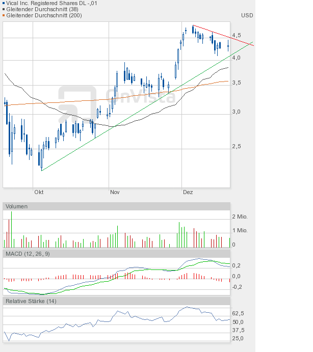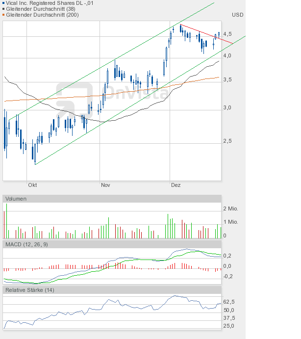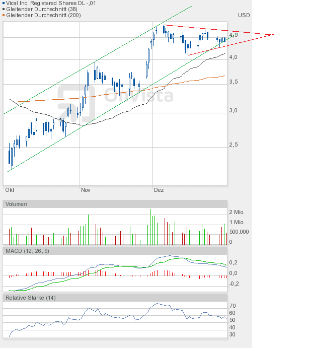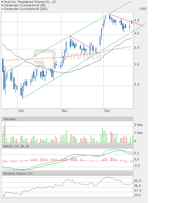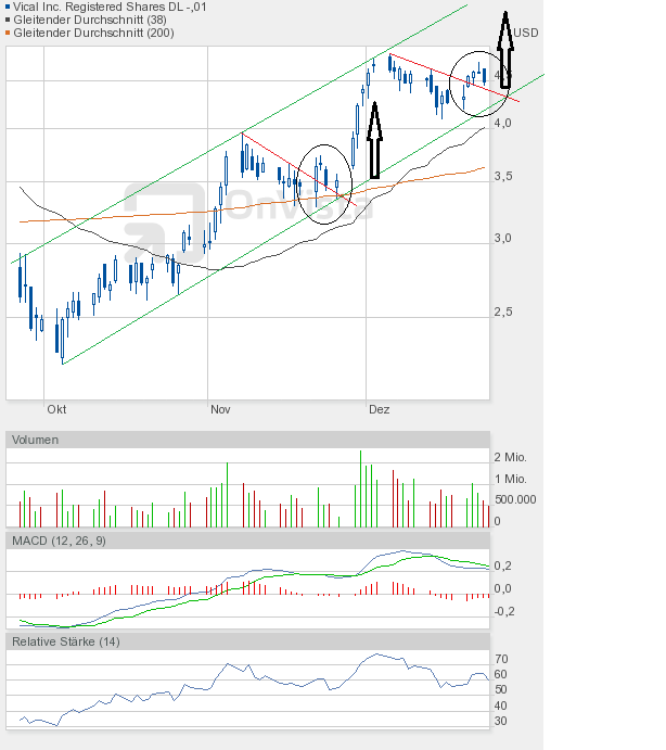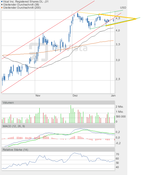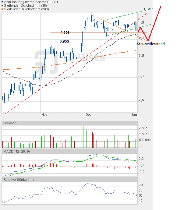 Das gestern angesprochene gelbe Dreieck wurde kurz vor Schluss nach unten aufgelöst, als ein seltsamer Kursrutsch eintrat. Damit sind alle Aufwärtstrendkanäle zerstört. Das war nicht wirklich mein Traumszenario. So lange sich Vical aber noch über der orangenen fallenden Linie aufhält, und was noch viel wichtiger ist, die 3,95$ verteidigen kann, so lange bleibe ich optimistisch was die 5,30$ angeht. Bei 3,95$ war ja vor wenigen Wochen eine Kreisformation nach oben aufgelöst worden, was einem massiven Kaufsignal entsprach, Ihr könnt Euch sicher noch daran erinnern. Die 3,95$ könnte nächste Woche angesteuert werden. Hier würde dann ein extrem wichtiger Kreuzwiderstand verlaufen. Kreuzwiderstände werden nahezu 100% nicht gebrochen und dienen als Fortsetzung eines Trendes. Bei Vical zeigt der Trend nach oben, auch wenn wir uns erst einmal eine Etage tiefer befinden, momentan läuft nur eine Korrektur. Wie gesagt, die Meinung vertrete ich, solange die 3,95$ hält. Hält auf Schlusskursbasis die 4,20$, dann dürfte uns die 3,95$ erspart bleiben. Oder gibt es nächste Woche an einem Tag einen kräftigen Rutsch auf 3,95$ mit einem anschließenden Intraday-Reversal auf mindestens 4,20$? Nichts für schwache Nerven. |