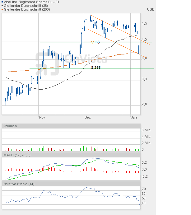 Vical schloss gestern bei 3,64$. Nachbörslich stieg sie auf 3,72$. Eine technische Gegenreaktion wird demnächst sicherlich kommen. Ein deutlich positiveres Bild ergibt sich jedoch erst mit dem Überwinden der 3,95$.