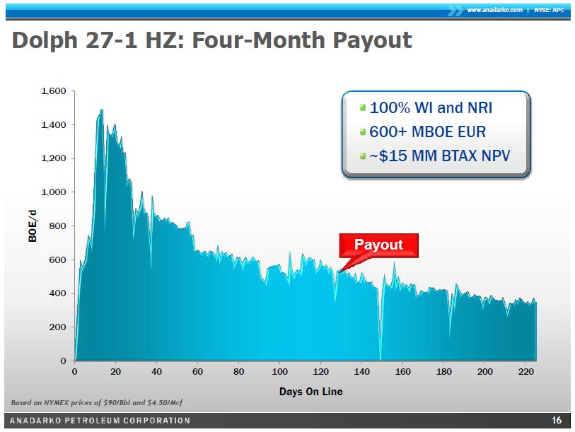 Ein Treffer wie Dolph 27-1 HZ mit "Four-Month Payout" wäre natürlich ein Hit (siehe Seite 16). Aber das wäre dann doch zu optimistisch. Immerhin bohrt Anadarko ja mehr als das halbe Wattenberg Feld. Da ist die Wahrscheinlichkeit für solche Supertreffer natürlich extrem viel höher. Also ich wäre schon sehr zufrieden wenn sie den Mittelwert von Anadarko erreichen. Warten wir erst mal das nächste Triple ab. Wenn der wieder 3 mal trifft wäre ich endgültig von den "Jungs" überzeugt.