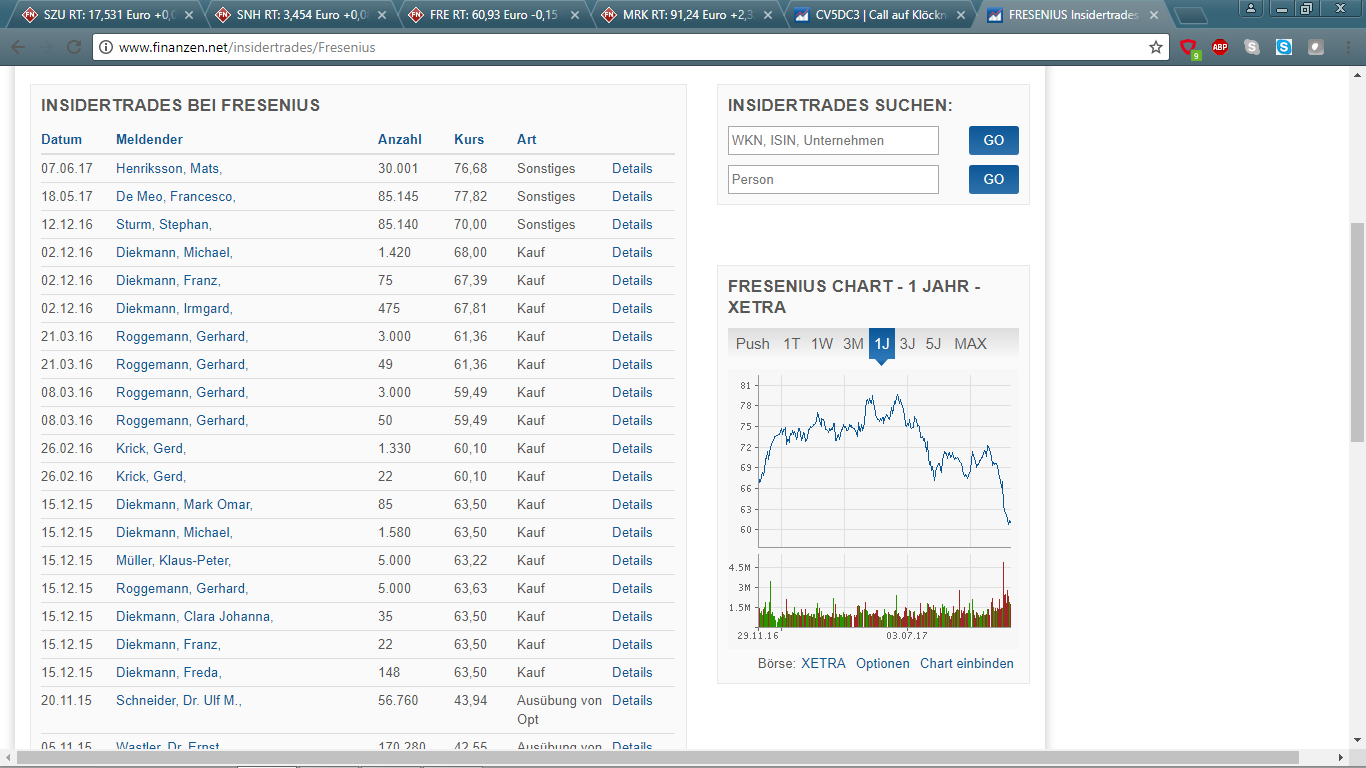 | Analysten stufen Fresenius ab. Profis verkaufen i.d.R. oben und verkaufen unten. Fresenius wie Merck - die wohl defensivsten Werte im DAX haben beide in 2017 die schlechteste Performance im DAX hingelegt. Wer für eine Analyse keinen Cent bezahlen muß, sollte mit aller Vorsicht diese Infos behandeln. Nicht umsonst steht weiter unten ein Text über Interessenkonflikt. Aber selbst wenn dieses Analysehaus nicht im Wert investiert ist, können größere Kunden diese Aktie einsammeln wollen und die Analysten helfen bei diesem zahlenden Kunden gerne etwas aus. Für mich in bestimmten Umständen immer ein Indikator für steigende Aktie. In den letzen Tagen war auch gut zu erkennen, dass Merck und Fresenius eine Umkehr-Reaktion zeigen, aber zumindest eine offensichtliche Bodenbildung. Wechseln sich täglich mit stärkeren Anstieg ab. Heute ist es Merck, die einen schönen Anstieg verzeichnet, obwohl gestern ein Medikament eine Phase nicht bestanden hat. In beiden Werten gibt es eine sehr gute Chance für eine Jahresendrallye. Für mich die Top-Performer für 2018 im Premium-DAX |