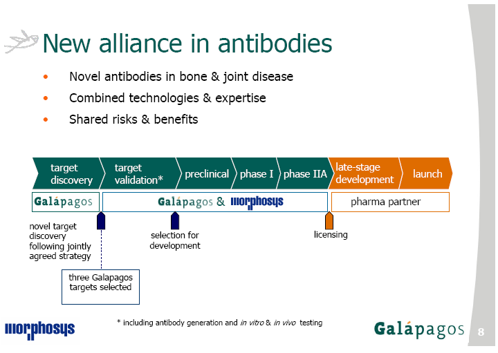 Der Galapagoschef hat von win-win situation gesprochen. Bisher entwicklet Galapagos nur small malecules. Eigene Erfahrungen mit Antikörpern haben Sie nicht. Und mit MOR holen sie sich ohne hohe Investitionen eine führende Technologie ins Haus und nützen sie für ihre Pipeline.