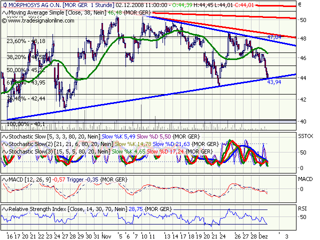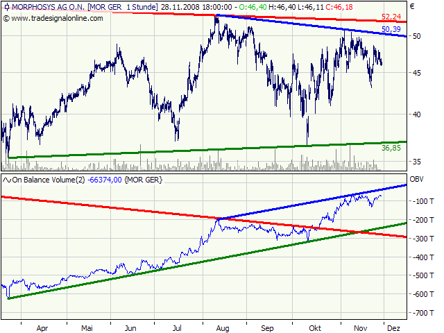 Die Frage ist, reicht ein relative Outperformance gegenüber dem Tecdax und auch anderen Indizes, um schon von einer Stärke zu reden und verharren wir auf diesem Niveau, oder erwartet die Morphosysanhänger noch ein kleiner Jahresendhype in Regionen jenseits der 50er Marke.