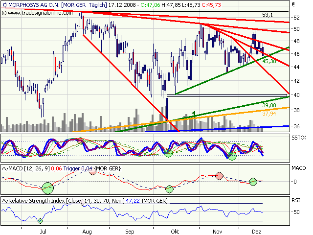 Ich war schon immer ein Sturkopp. Speziell in den letzten paar Monaten war ich gut beraten, bei "bestimmten" Entscheidungen vorher keine Medien wie Internet, Funk, Fernsehen....verfolgt zu haben bzw. mich nicht beeinflussen zu lassen. Je mehr Menschen von einem schlechten Börsenjahr 2009 reden, um so mehr wird mein Depot vorher gefüllt und zugemauert. Zugemauert deswegen, weil es schon zu volatilen Märkten kommen wird in beide Richtungen, da möchte ich mich vor Kurzschlussreaktionen schützen. Aber rechne ich eher mit sehr kurzen Ausschlägen, bei Morphosys sowieso. Da sehe ich einen über viele Jahre stetigen Trend nach oben, auch mit Zuckungen, aber insgesamt nach Norden!
