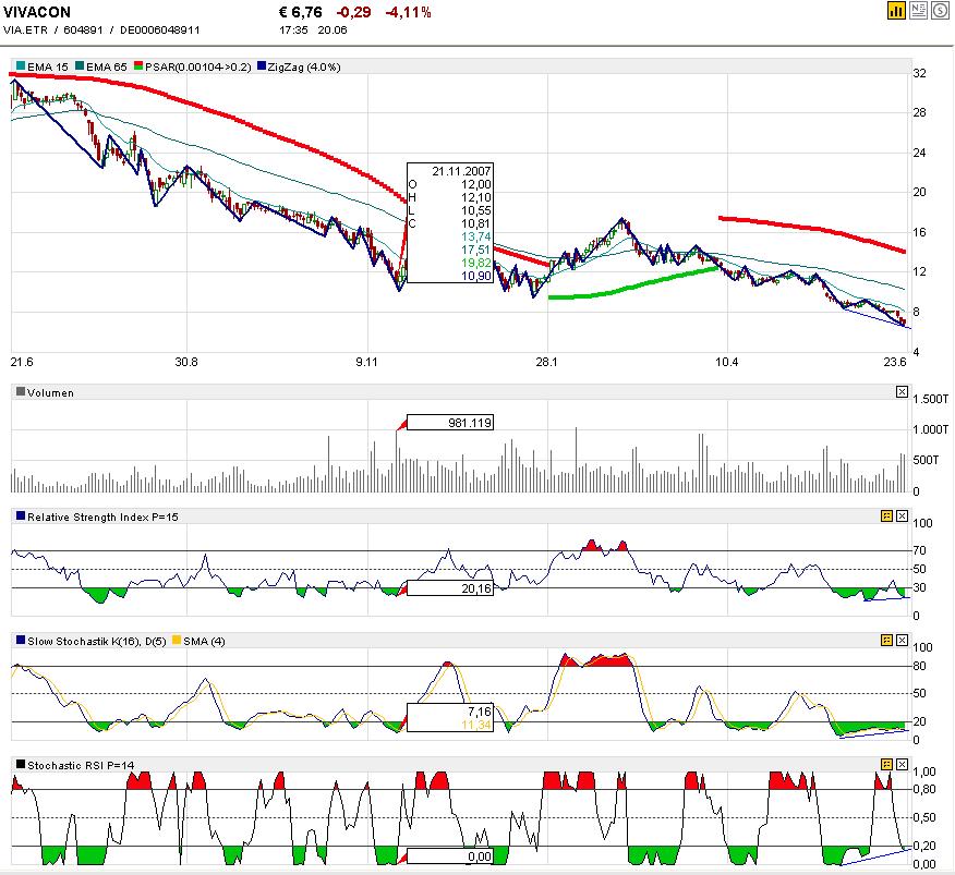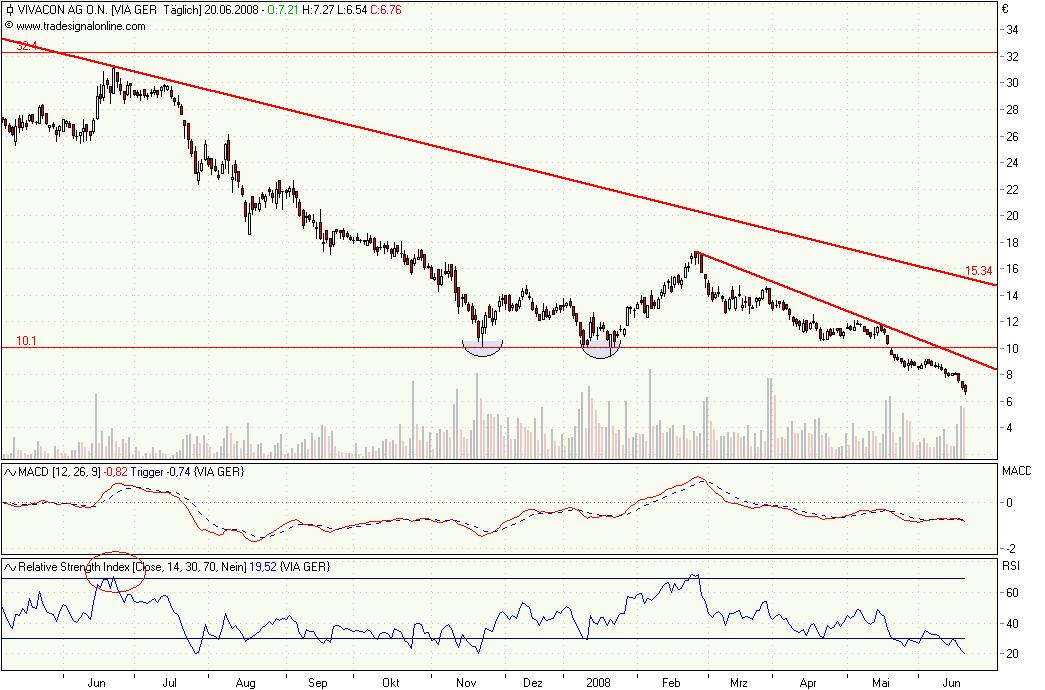 Wenn die Märkt in Übertreibungsphasen sind, dann interessiert die meisten Anleger weder der faire Wert einer Aktie, noch ob die Indikatoren Divergenzen bilden oder die Kurse in der Nähe von Unterstützungen oder Widerständen sind. Bei der nächsten "Hiobsbotschaft" bezüglich Immo-Krise oder Konjunktur kann ganz schnell die nächste Verkaufswelle einsetzen und das können bei Werten wie Vivacon ganz schnell 2-stellige Prozente Verlust sein. Für Trader ist da eine rigorose Risikokontrolle angesagt. Als Langfristanleger kann man bei einigermaßen vernünftigen Bilanzdaten diese Übertreibungen etwas entspannter sehen, auch wenn es wieder relativ ist, aber wann der Kurs im Vergleich zum fairen Firmenwert übertrieben ist.