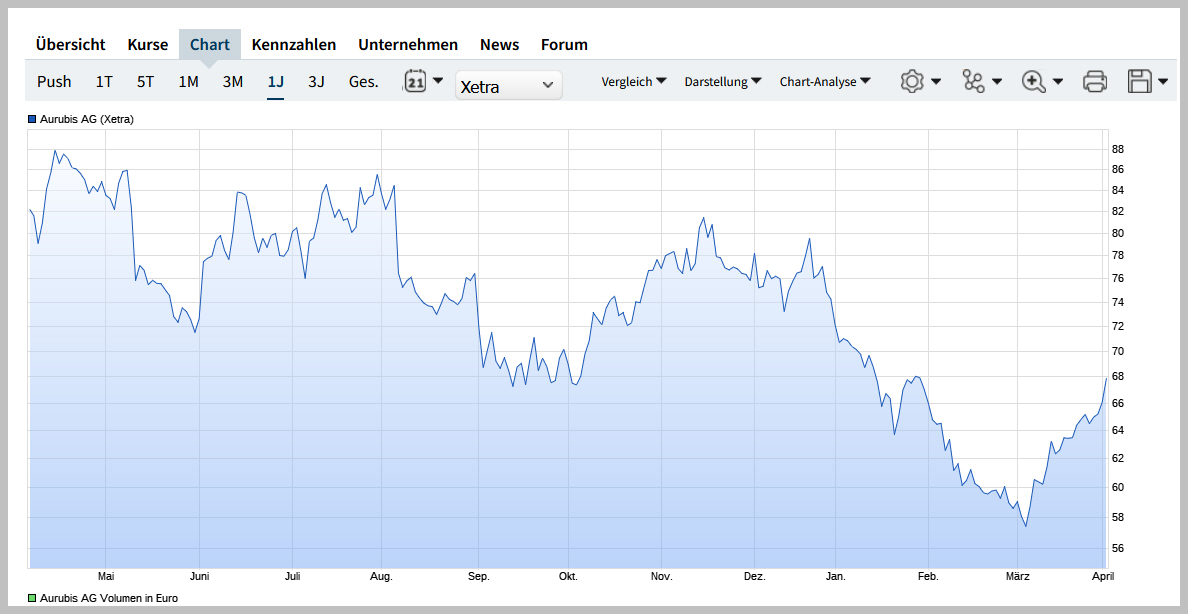 Das Mehrjahrestief in dieser Trendbewegung hatte im März 2024 bei etwas unter 57,40 Euro gelegen. Von dort aus war es seither wieder aufwärts gegangen, und zwar bis an die den Abwärtstrend markierenden Linie bei aktuell etwa 73 bis 74 Euro.