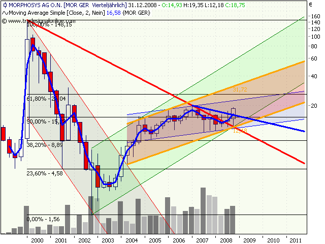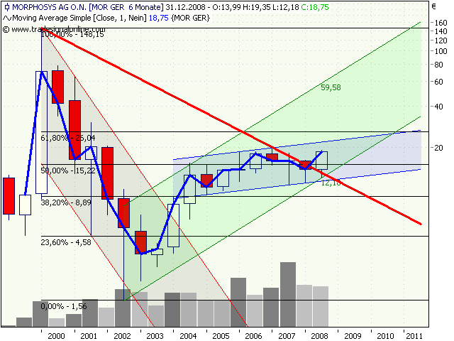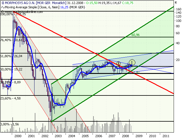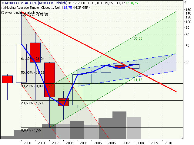 In Orangerot ist der Novartis-Trend eingezeichnet. Er hat zwar noch nicht sehr viele Auflagepunkte aber er umschliesst alle Kurse, seit Novartis den ersten Deal mit Morphosys abgeschlossen hat. Der erste deal half zum break even, die Erweiterung schaffte Planungssicherheit, der Großdeal Ende 2007 ermöglichte Morphosys den beschleunigten Aufbau einer eigenen Pipeline.