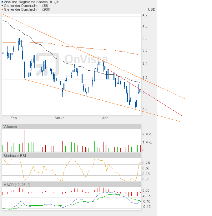 Wie man dem Chartbild entnehmen kann, steht die nächste Entscheidung vor der Tür. Wir sahen heute eine enge Handelsspanne, die sowohl Ober- als auch Unterbegrenzung des bullishen Keils annähernd auslotete. Kommt es in Kürze zum kleinen Ausbruch, also dem Fall unter die grüne Linie, dann wäre das auch kein Desaster, aber kurzfristig negativ. Und der Verbleib im bullishen Keil würde sich verlängern. Oder kommt es endlich zum großen Ausbruch, also zur Auflösung des bullishen Keils? Es dürfte dann eine Rallye-Phase beginnen. Ein Indiz dafür könnte der Stochastic RSI liefern, der sich heute auf 0,25 halbierte, obwohl Vical nur 1 US-Cent nachgegeben hatte. Schlusskurs 3,00$. Also Augen auf beim Eierkauf. |