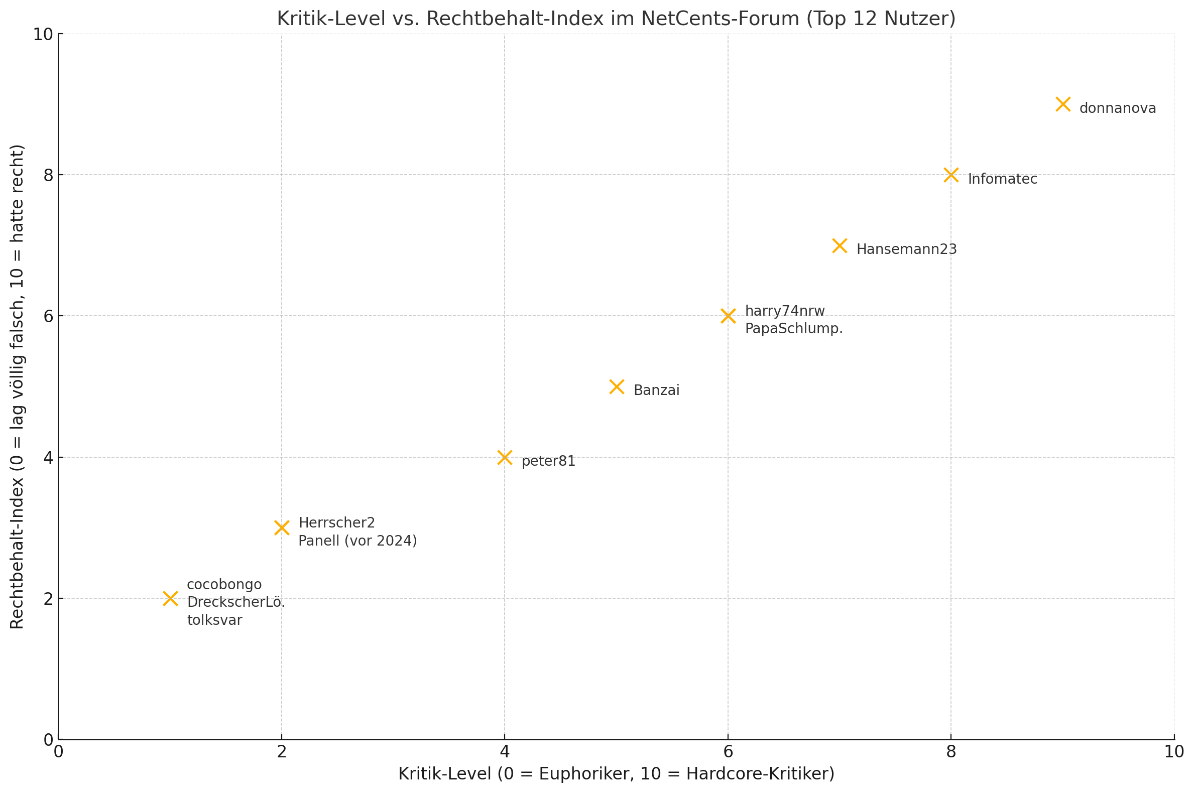 Fazit: Kritischer Aufklärer oder destruktiver Dauernörgler? donnanova war – objektiv betrachtet – einer der inhaltlich treffsichersten Nutzer im Forum. Seine frühe Skepsis gegenüber NetCents war in vielen Punkten berechtigt und vorausschauend.
