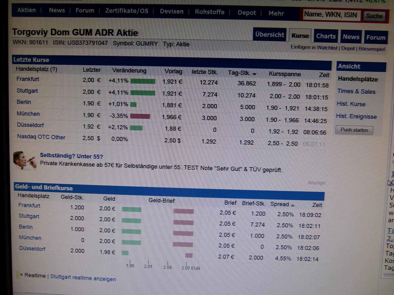 Kommentar: Komisch nur, letzte Woche konnte sich keiner mit meinem Angebot von 1,42 Euro/ADR anfreunden. Heute Morgen ging's flott und schnell zu Sache. Dem GUM-Verkäufer ging es heute nicht schnell genug seine ADR´s loszuwerden. *g*