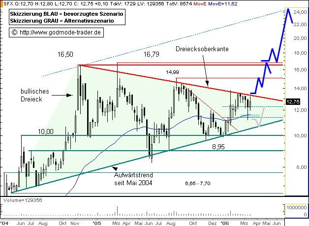 Auch charttechnisch sieht's noch nicht schlecht aus, der Kurs befindet sich jetzt genau an der unteren Begrenzung des Keils bei etwa 10,50 Euro und hat damit den von Godmode-Trader beschriebenen Alternativverlauf gewählt (in grau eingezeichnet). Hoffen wir, dass die Marke hält und es dann bald mit der Vermeldung des Zukaufs aufwärts geht.