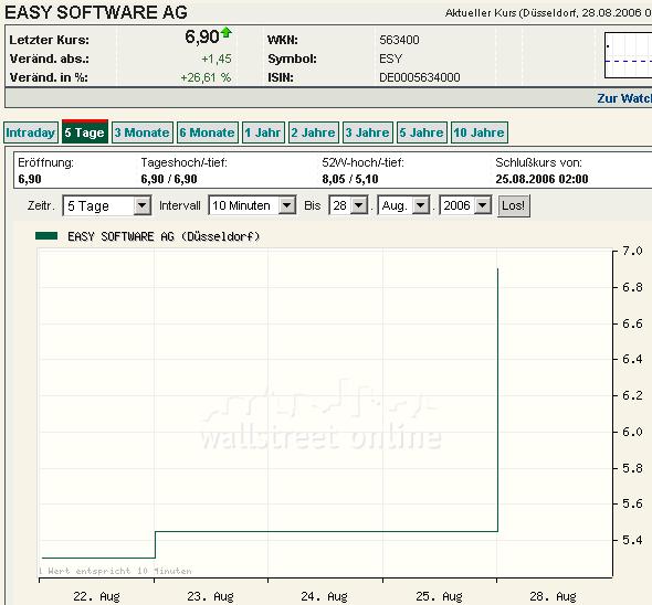 Die Aktie von EASY SOFTWARE schloss heute in Frankfurt mit einem Plus von 3,48 Prozent auf 5,65 Euro. (25.08.2006/ac/n/nw)