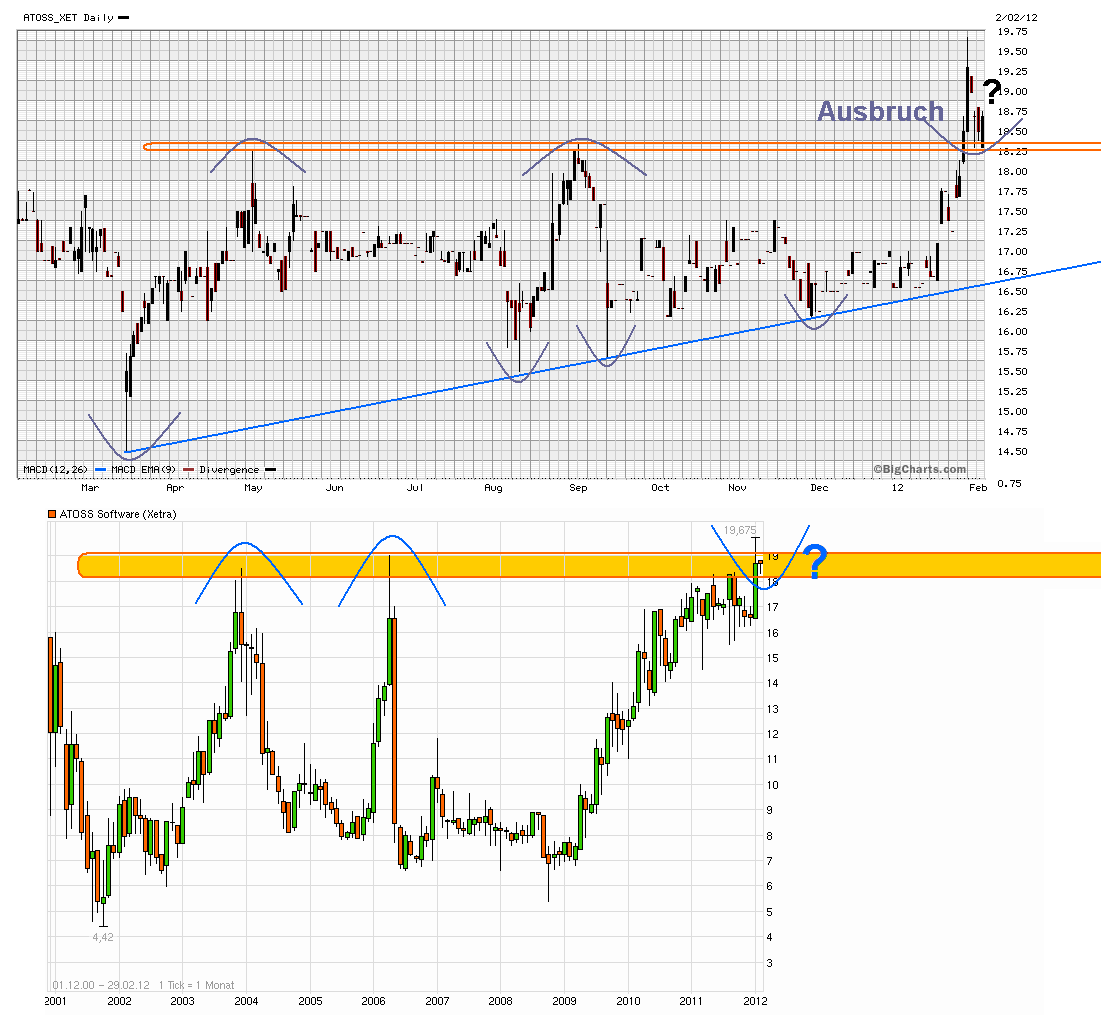 Mal wieder sehr solide Zahlen. Divi dürfte somit um die 71 Cent liegen. Hätte es schön gefunden, wenn man sich zu einer zusätzlichen Sonderausschüttung geäußert hätte. Die nicht betriebsnotwendige Liquidität ist einfach in den letzten Jahren zu stark wieder angewachsen nachdem man seit 6 Jahren ein Rekordjahr nach dem anderen hinlegt. Die Prognosen für das laufende Jahre ist wie in all den Jahren zuvor immer bewußt sehr, sehr konservativ ausgelegt worden. Dürfte aber wie in all den Jahren zuvor im Jahresverlauf dann immer weiter geschmeidig problemlos nach ober angepaßt werden ;) Die Auftragseingänge sind in den letzten Monaten hervorragend gewesen und die installierte Basis der Software bringt fortlaufend höhere Serviceeinnahmen. Der jüngste Anstieg vor Bekanntgabe der Zahlen war schon interessant. Dadurch wurde der Kurs auch der Seitwärtsrange der 12 Monate zuvor befreit mit neuen Mehrjahreshochs. Jetzt gilt es zu beobachten, ob man sich über dem Bereich von roundabout 18,30€ halten wird. Zudem liegt man hier im Top-Bereich an dem 2003 und 2006 Ende war. Geht man jetzt nachhaltig über die 19€, dann ist der alte Widerstand ausradiert und der Weg nach oben weit offen. Rein von der Bewertung her wären Kurse über 20€ locker zu rechtfertigen. Atoss hat 2011 knapp über 1,40 pro Aktie verdient. Man hat pro Aktie ca. 6 € Liquidität. Damit bezahlt man für das operative Geschäft momentan nur ein KGV von ca. 9. Bei so einer soliden Aktie mit dem Wachstum der letzten Jahre sollte man locker dafür auch ein KGV von 12-13 rechtfertigen können für den operativen Bereich. Ich denke fair wäre die Aktie daher erst bei ca. 23/24€ bewertet.
