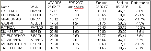 Interessant ist aber ein Vergleich der Performance aller DAX-gelisteten Immo-Werte seit Beginn der Korrektur. Da die Korrektur am 26.2.07 anfing, habe ich mal den Schlusskurs am 23.2.07 mit den Schlusskursen von gestern (5.3.07) verglichen und ich stelle nochmal die Frage: