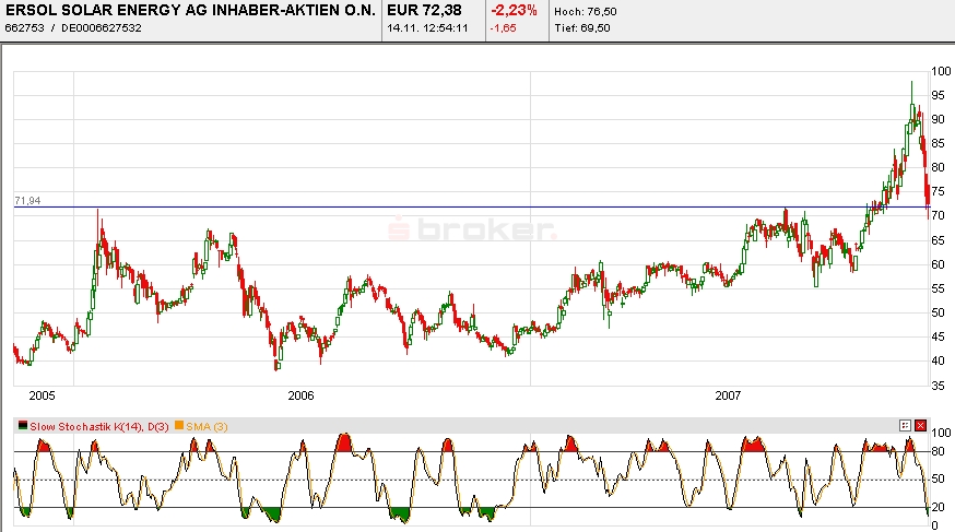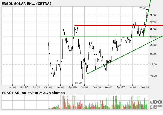 Das mit der Bewertung sehe ich genauso wie ConnyM, habe es ja schon ein paar Mal geschrieben, sicherlich hat Ersol nicht ganz die Bewertung einer Q-Cells oder Solarworld verdient, zumal auch noch ein paar Unsicherheiten bzgl. der Erreichung der ambitionierten Wachstumsziele für 2008 herrschen, aber sie ist ja nichtmal halb so teuer auf KGV-Basis, und das ist dann doch extrem übertrieben. Würde ein KGV von 23 für 2008 als fair erachten, das wäre dann ein Kurs von knapp 100 Euro. Und den sehen wir innerhalb der nächsten 6-8 Monate, da bleibe ich bei...