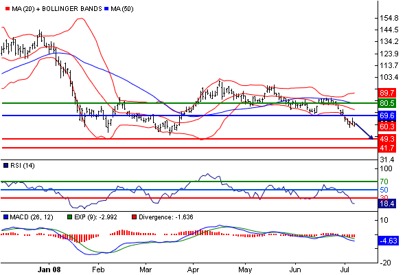Kurzfristige (kfr.) Meinung: Verkauf Mittelfristige (mfr.) Meinung: Verkauf Veränderung kfr.: Veränderung mfr.: Unterstützung: 45.4 / 49.3 / 53.0 Widerstand: 67.0 / 69.6 / 76.4 Unser Pivot-Punkt liegt bei 69.6. Unsere Meinung: solange 69.6 einen Widerstand bilden, dominiert die Abwärtstendenz Alternatives Szenario: über 69.6 liegen die nächsten Ziele bei 76.4 und 80.5 Analyse: der RSI liegt unter 30. Der MACD liegt unter der Signallinie und ist negativ. Die Konfiguration ist negativ. Es wird darauf hingewiesen, dass die Volumina seit einigen Tagen ansteigen.
