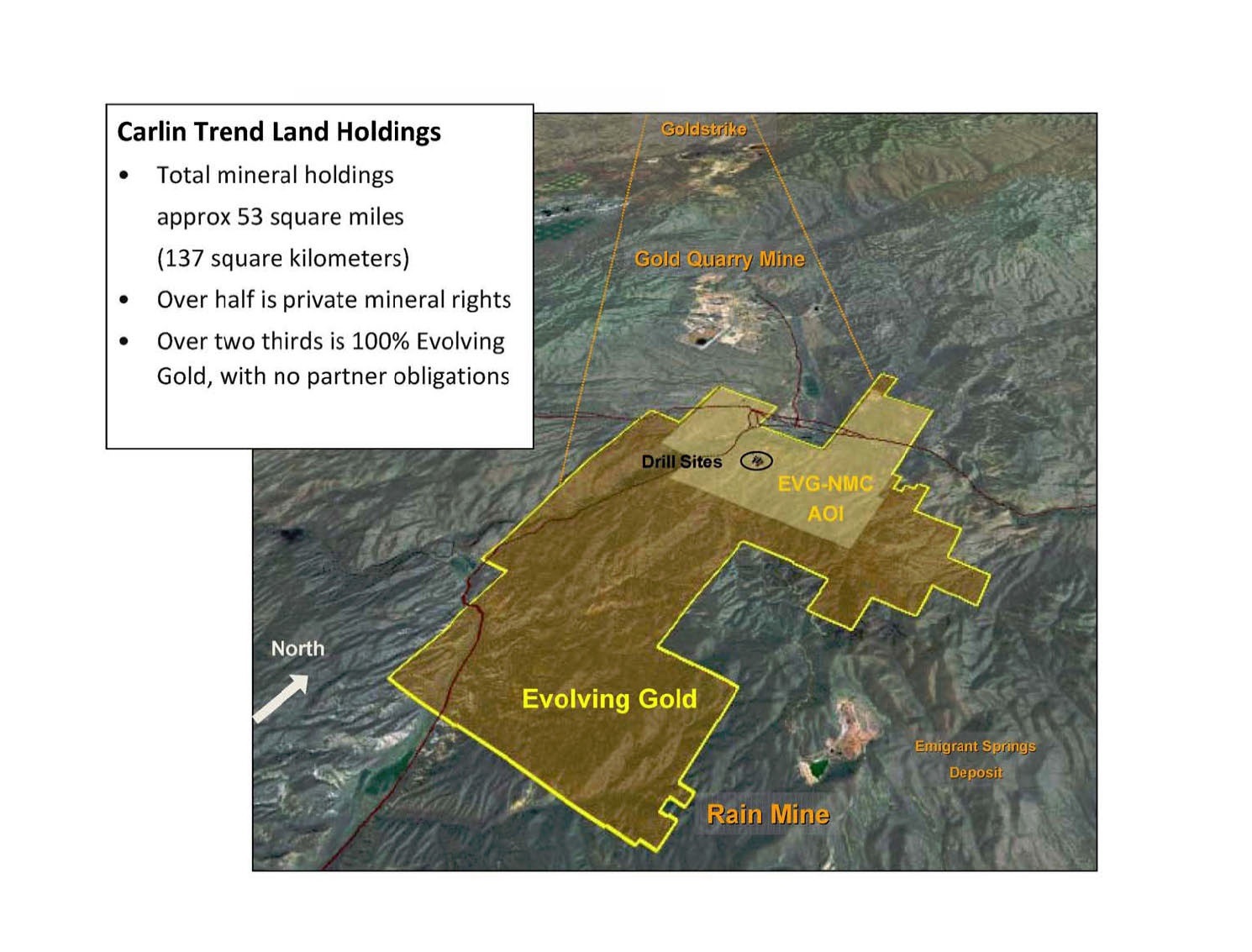 Evolving Gold has also negotiated surface access agreements for private, fee surface lands associated with its land package in the south Carlin Trend.