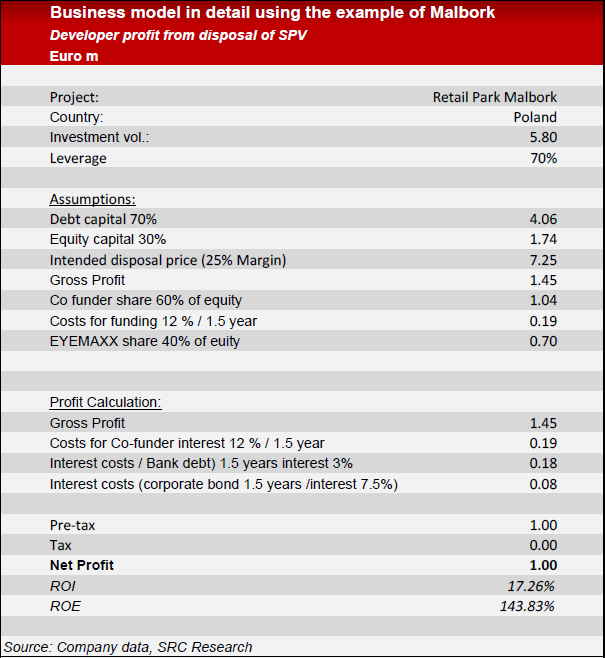Konservatives KGVe 2013 liegt bereits bei 3. Anhand der vermuteten Fertigstellungstermine der sich im Bau befindenden Projekte, sowie der laufenden Mieteinnahmen der Bestandsobjekte, gehe ich eigentlich von einem deutlich höheren EBIT aus, als in der Studie von SRC prognostiziert. SRC Prognose - EBIT 2012/2013: 5,44 Mio EUR Wenn man die Beispielrechung zur Gewinnberechung des Malbork Projekts aus der SRC Studie verwendet, sieht man, dass von der jeweiligen Gesamtinvestitionssumme durchschnittlich 1/6 (einsechstel) als Gewinn (nach Steuer) für Eyemaxx bleibt. Geht man davon aus, dass man 1/6 pauschal für alle Projekte anwenden kann, dann würde sich folgendes EBIT bei allen 5 laufenden Projekten errechnen: - FMZ Kittsee in Österreich ý Gesamtinvestitionssumme: 14,3 Mio € ý Ebit: 2,38 Mio € - FMZ Pelhrimov in Tschechien ý Gesamtinvestitionssumme: 2,1 Mio € ý Ebit: 0,35 Mio € - FMZ Olawa in Polen ý Gesamtinvestitionssumme: 2,1 Mio € ý Ebit: 0,35 Mio € - FMZ Malbork in Polen ý Gesamtinvestitionssumme: 5,8 Mio € ý Ebit: 0,97 Mio € - FOC in Stara Pazova (Phase 1) ý Gesamtinvestitionssumme: 13,2 Mio € ý Ebit: 2,2 Mio € + Mieterträge der Bestandsobjekte ca. 1 Mio EUR + x