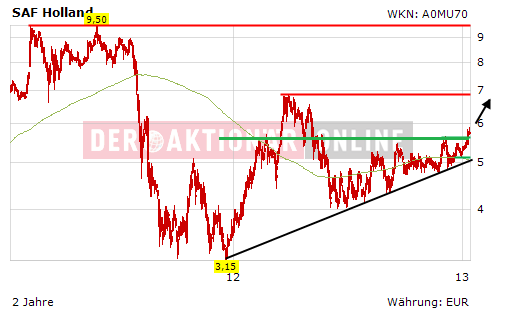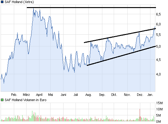 Die SAF-HOLLAND-Aktie ist damit ein spekulativer Kauf mit eher enger Stopp-Loss-Absicherung bei etwa 4,72 Euro, so die Experten vom "Frankfurter Börsenbrief". Das Kursziel werde bei 6,80 Euro gesehen. (Ausgabe 2 vom 12.01.2013) (14.01.2013/ac/a/nw)