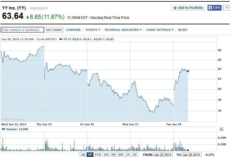 http://www.google.com/finance?q=NASDAQ%3AYY&ei=wV_vUun4BIKIwAPQSg … bis dahin ist es noch lange hin und es kann bei der Volatilität von YY ( auch mit dem Gesamtmarkt) noch eine ordentliche Achterbahnfahrt werden. Ich sehe Kurse um 60$ und darunter als Einstiegskurse und erwarte vor dem Jahresergebnis Kurse im Bereich 70-80$. Bisher fiel der Kurs unmittelbar nach guten Zahlen wieder durch Gewinnmitnahmen, so dass man durchaus auch mal bei neuen ATH´s Gewinne sichern konnte. Aber jene, die die ganze Zeit dabeigeblieben sind, sind bisher auch nicht schlecht gefahren. Nur meine Meinung, keine Kauf- oder Verkaufsempfehlung. Weiterhin viel Glück allen Investierten. |